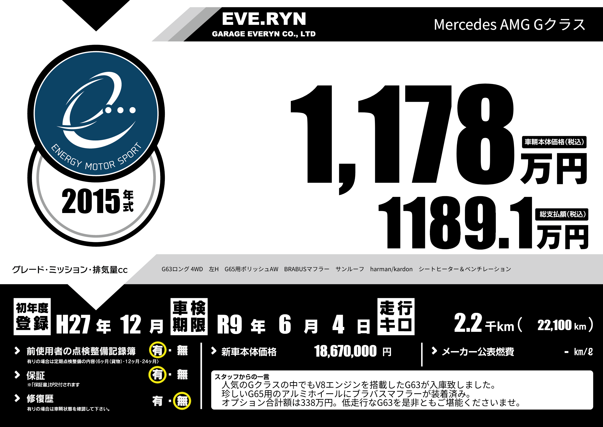 | 車名 | Mercedes AMG Gクラス | グレード ミッション 排気量 |