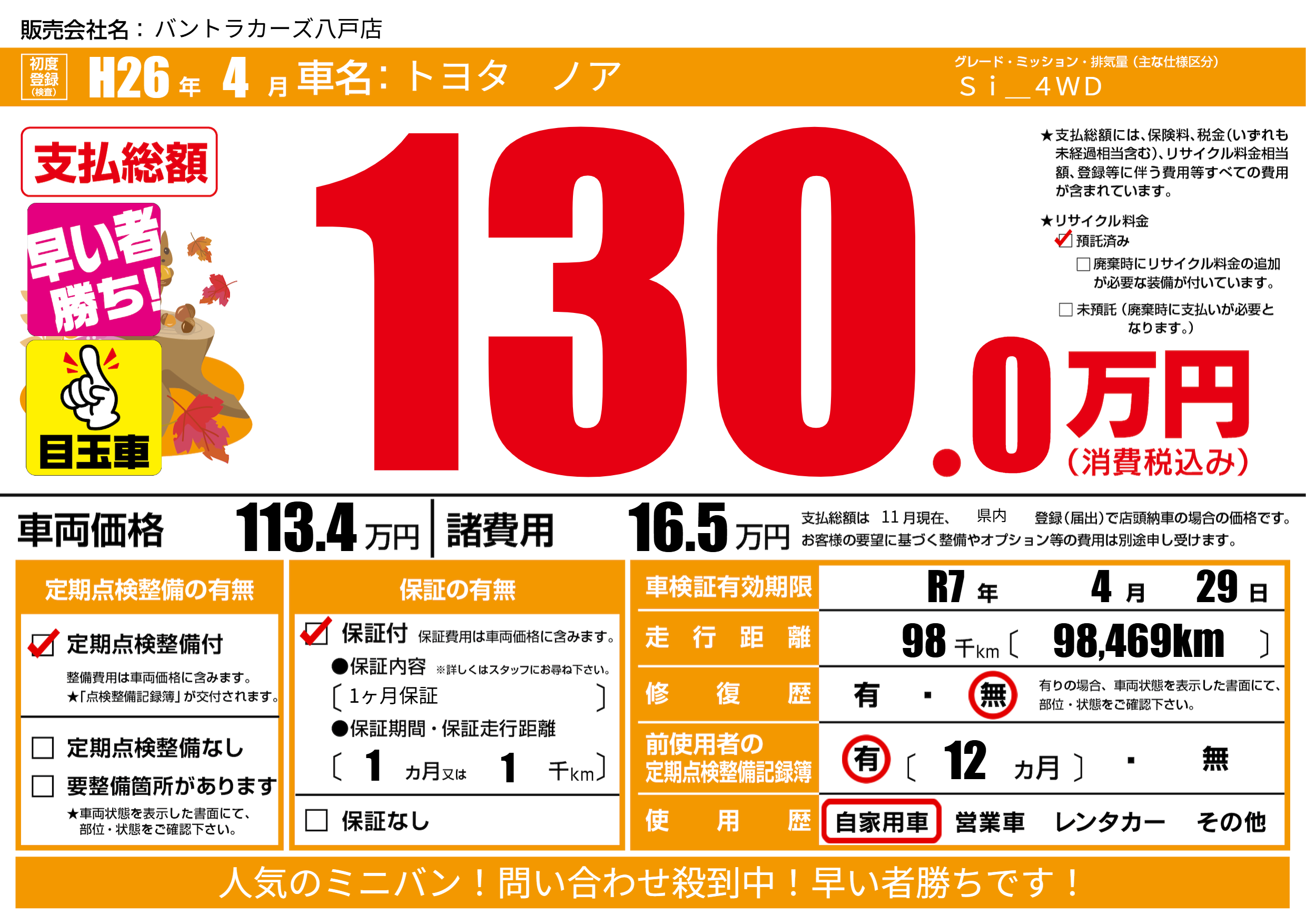 | 走行キロ | 9.8万km | 初年度登録 | H26年4月 |