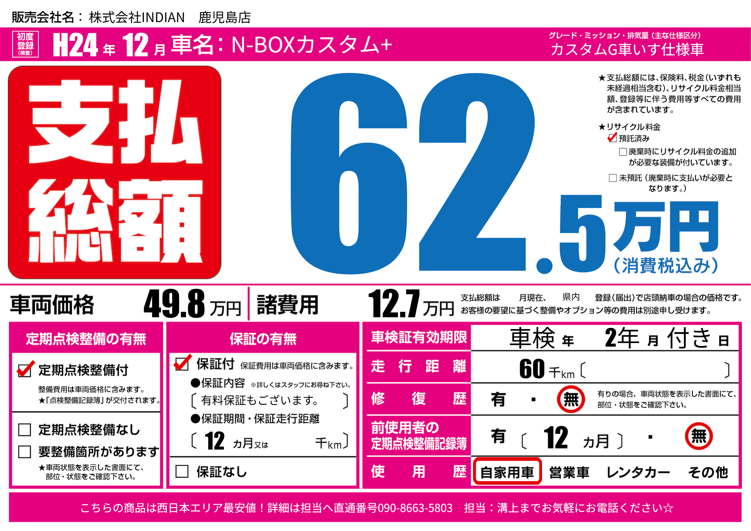 | 走行キロ | 6万km | 初年度登録 | H24年12月 |