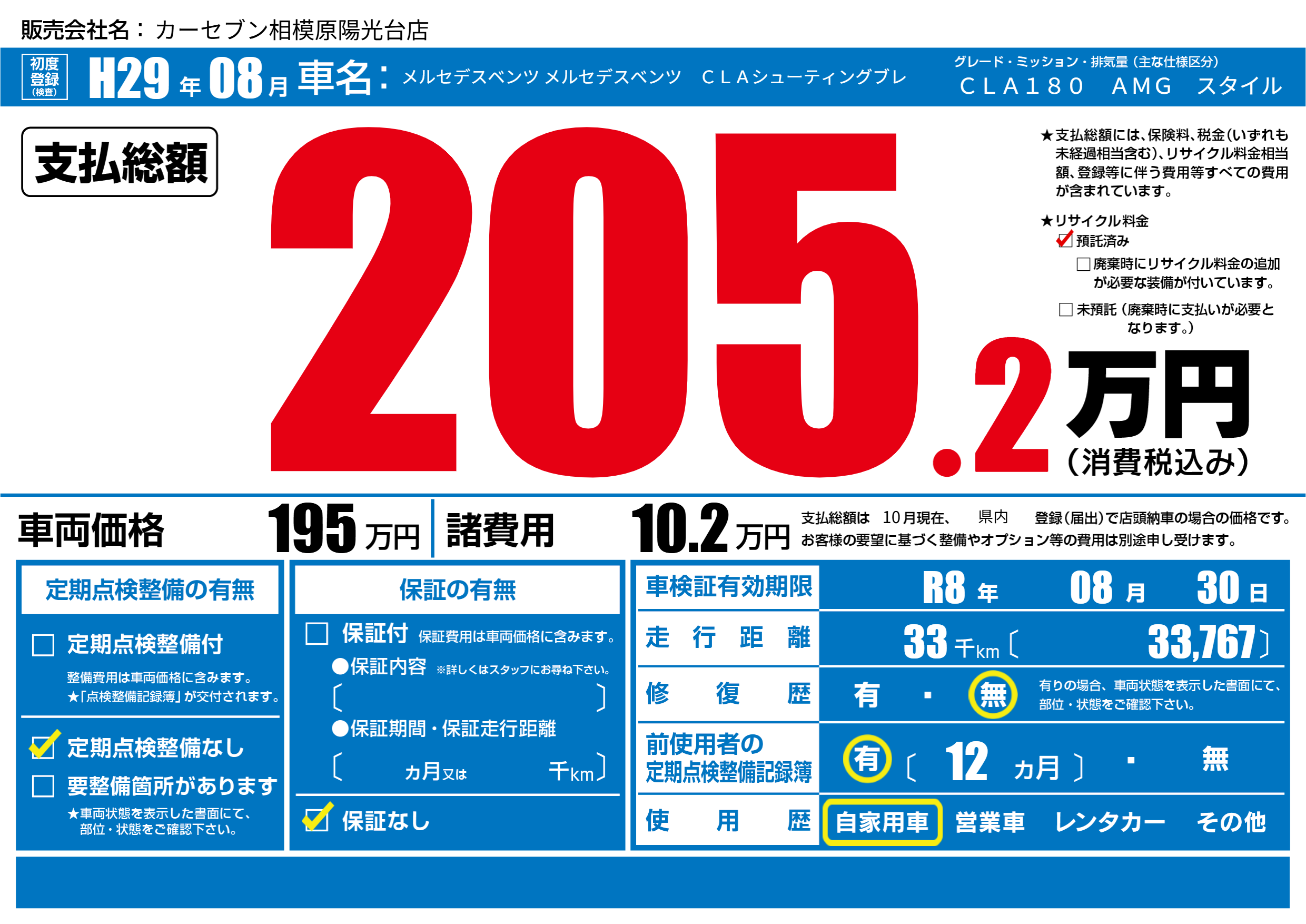 | 車名 | メルセデスベンツ メルセデスベンツ CLAシューティングブレ | グレード ミッション 排気量 |