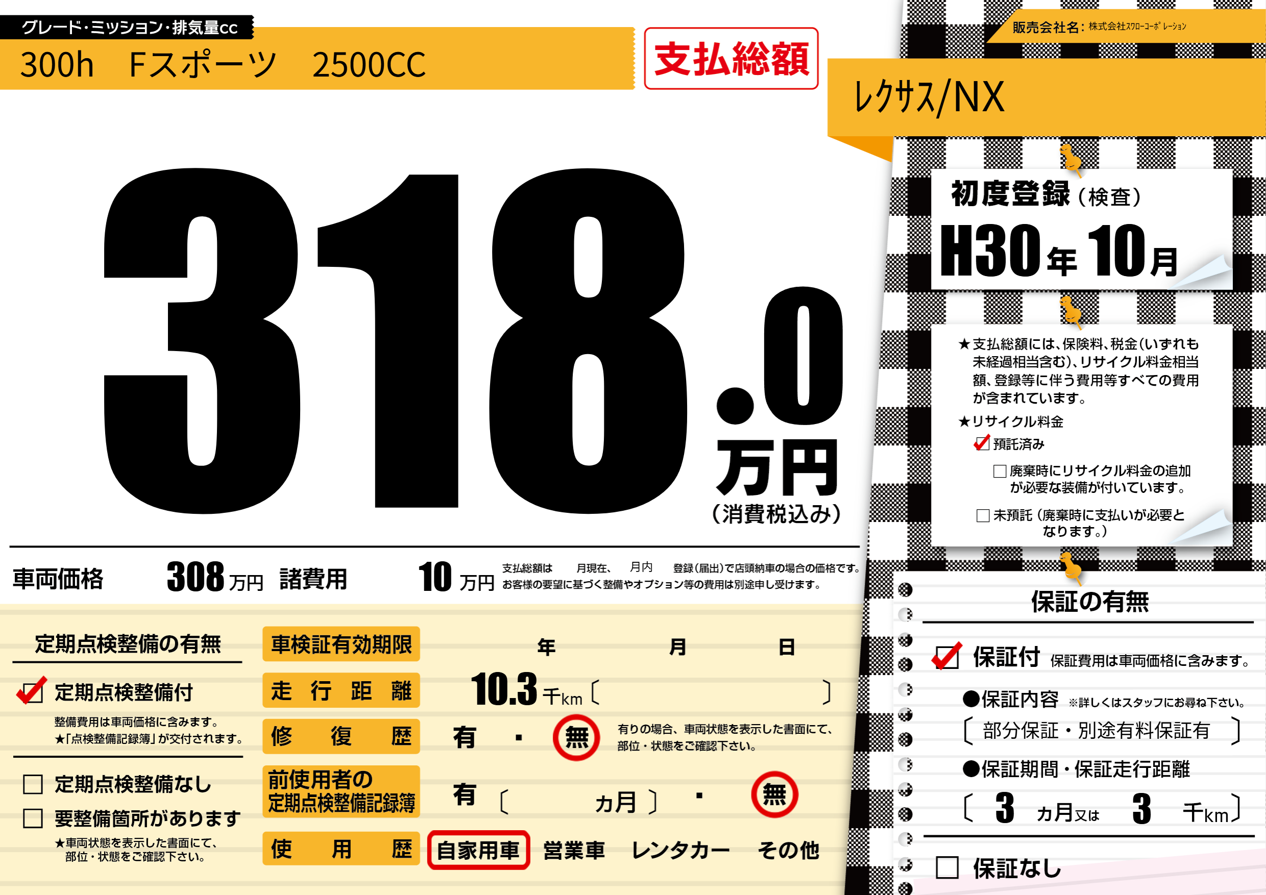 保証付き 保証内容(部分保証・別途有料保証有) 3ヶ月または(3)千kmまで |