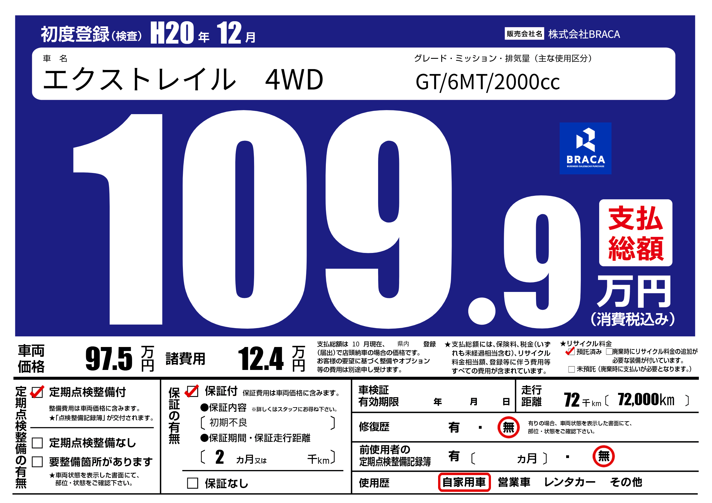 | 走行キロ | 7.2万km | 初年度登録 | H20年12月 |