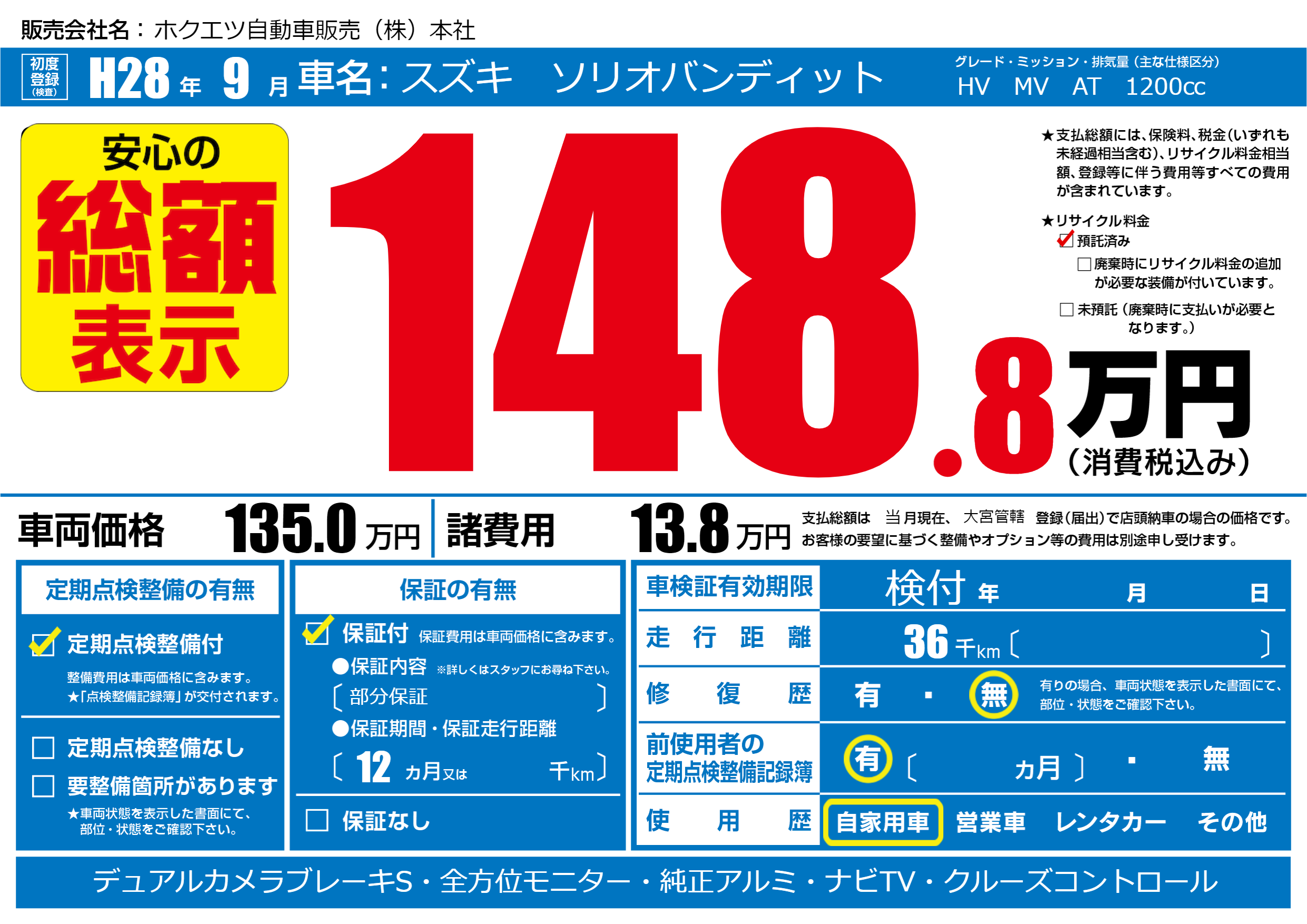 保証付き 保証内容(部分保証) 12ヶ月または()千kmまで |