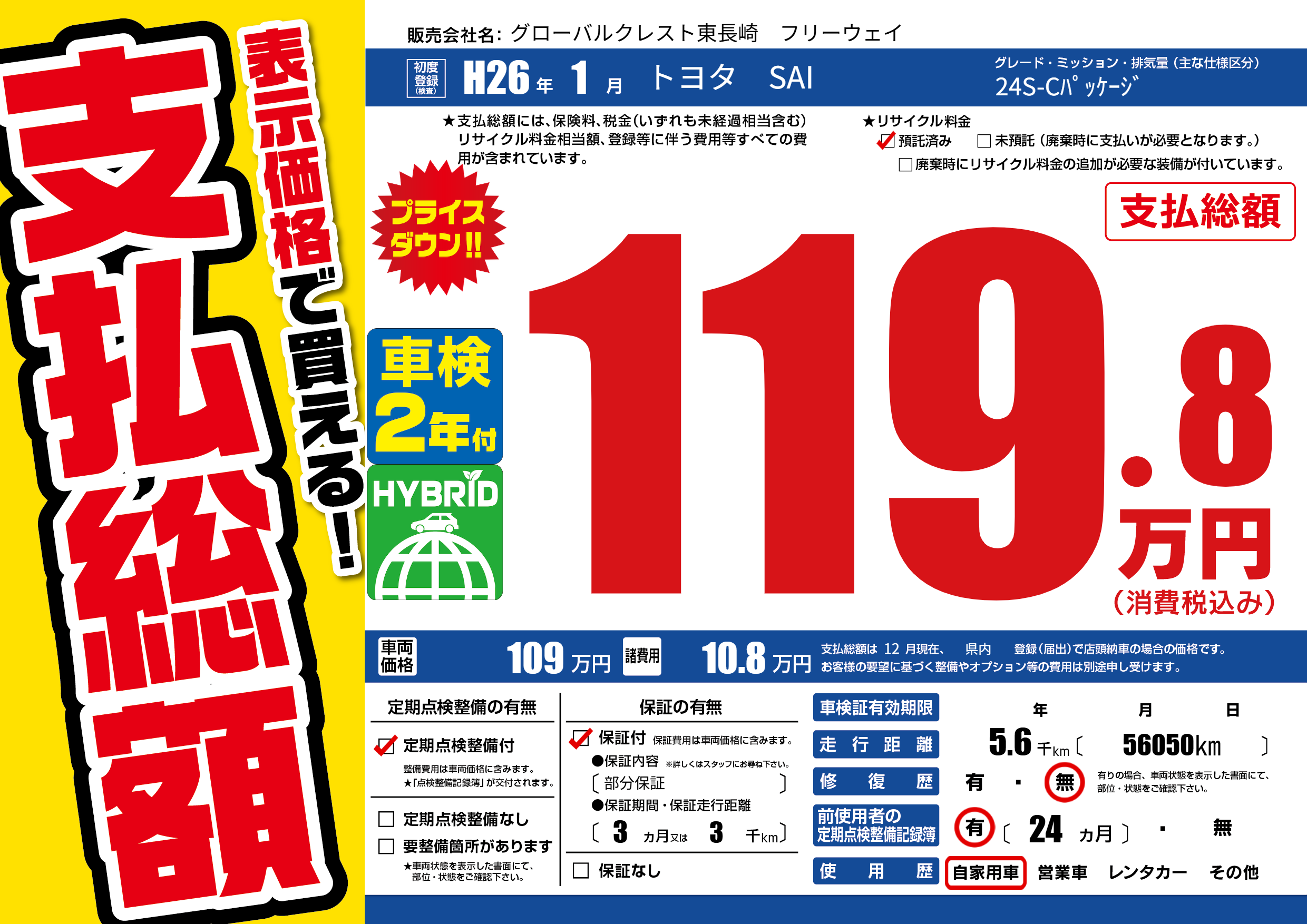 | 車名 | トヨタ SAI | グレード ミッション 排気量 |