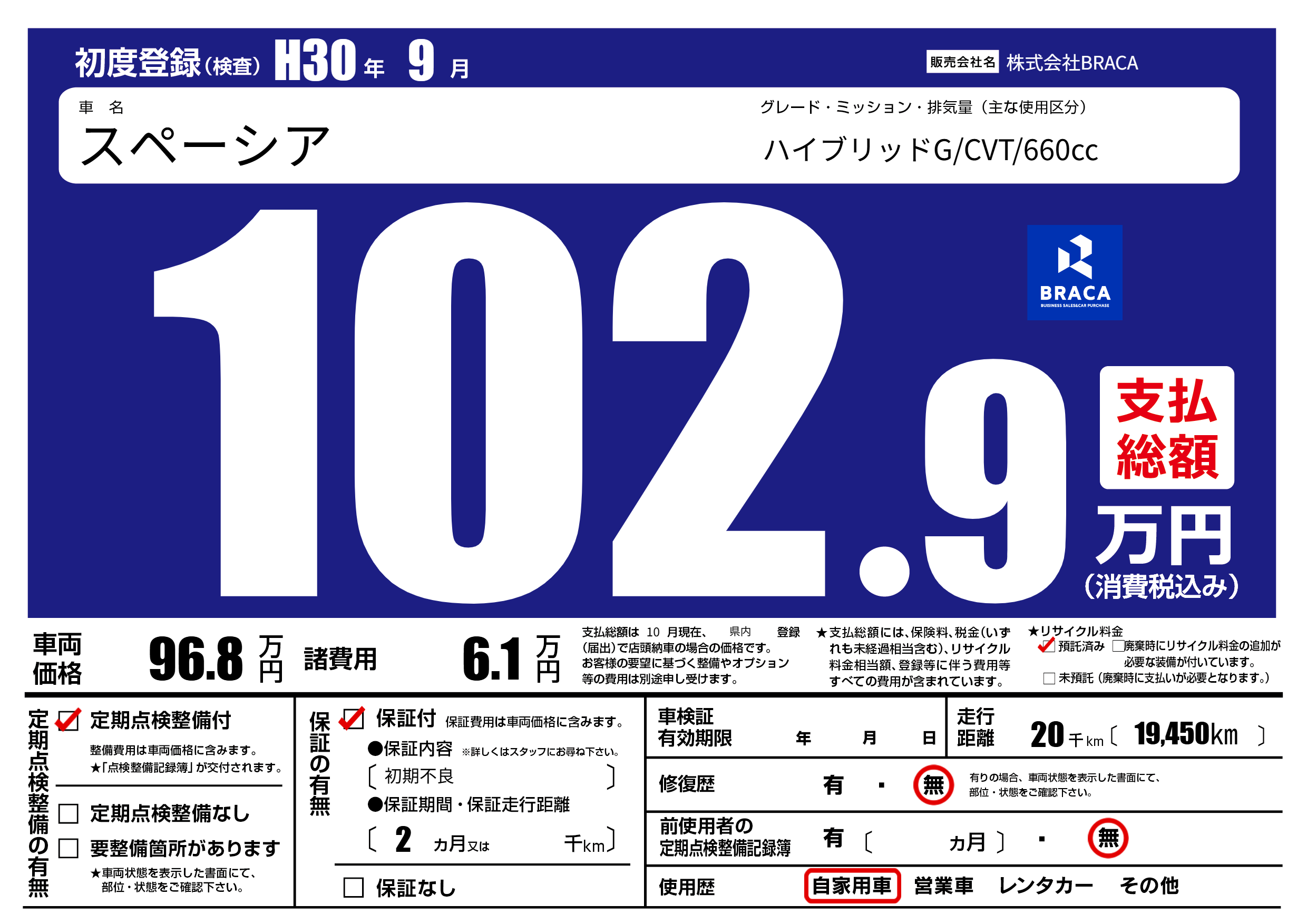 | 走行キロ | 2万km | 初年度登録 | H30年9月 |