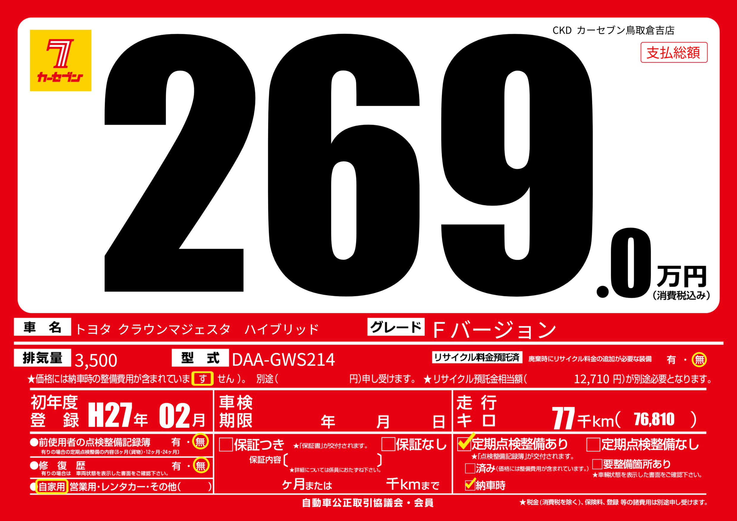 | 車名 | トヨタ クラウンマジェスタ ハイブリッド | グレード ミッション 排気量 |