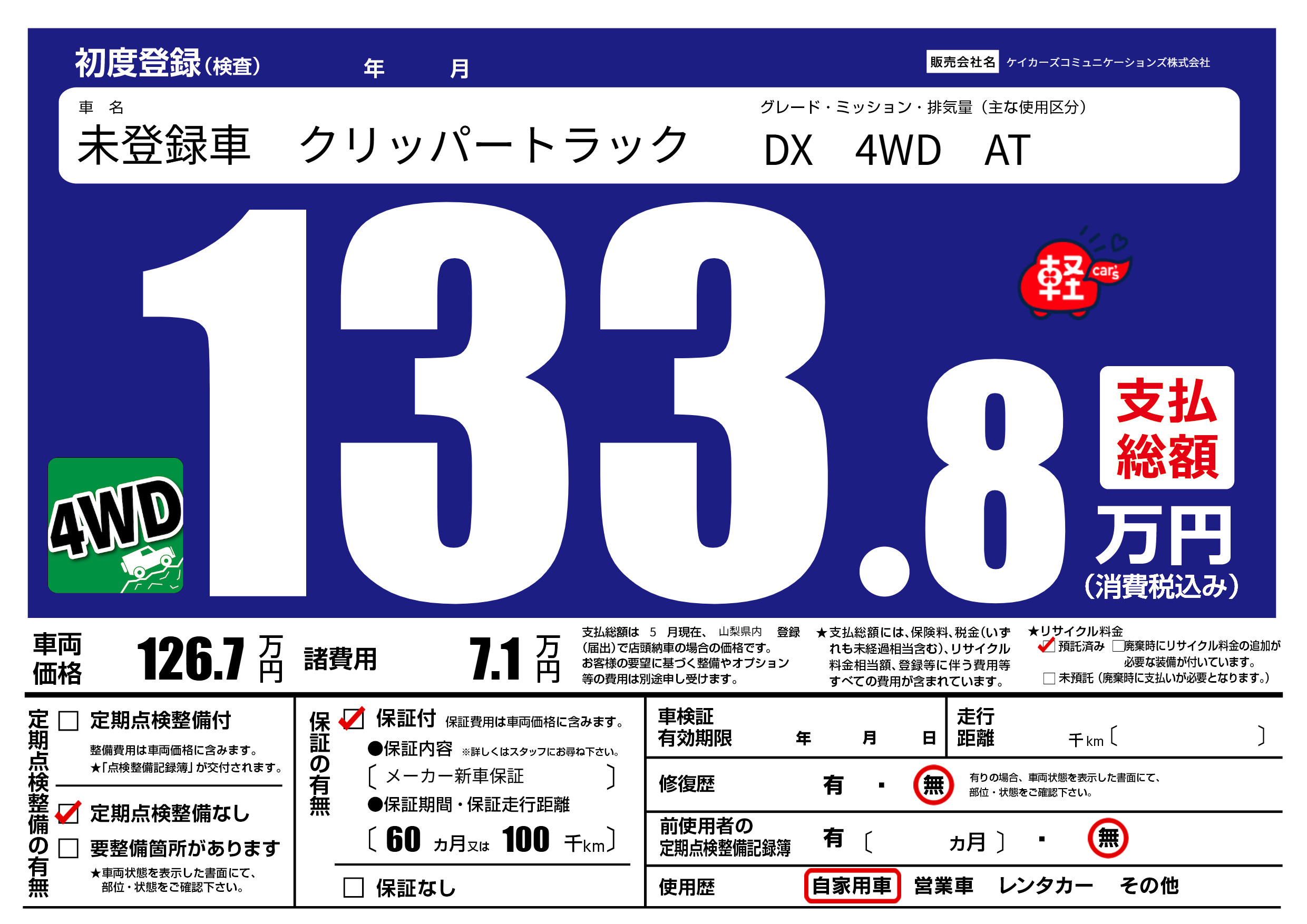 保証付き 保証内容(メーカー新車保証) 60ヶ月または(100)千kmまで |