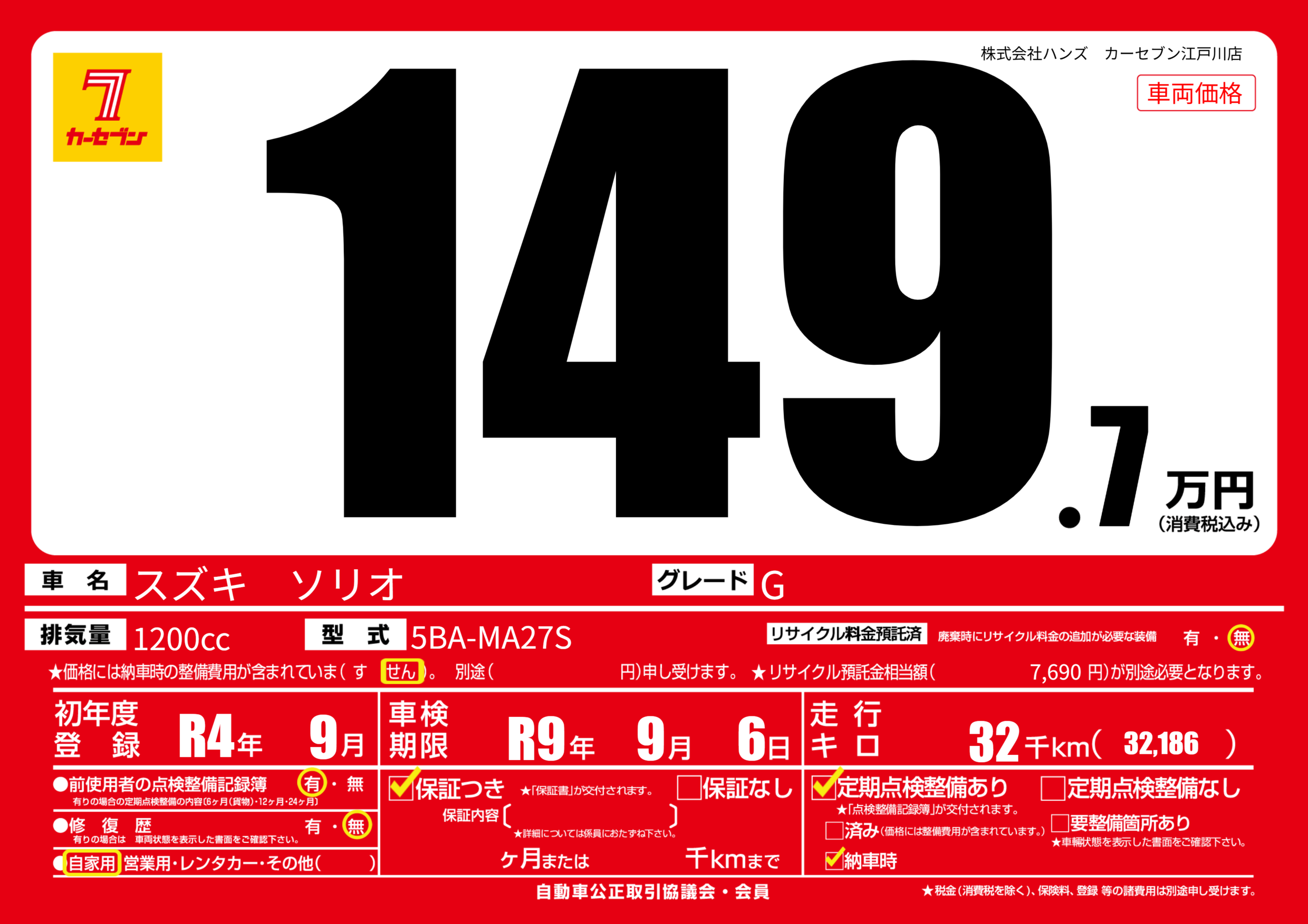 | 車名 | スズキ ソリオ | グレード ミッション 排気量 |