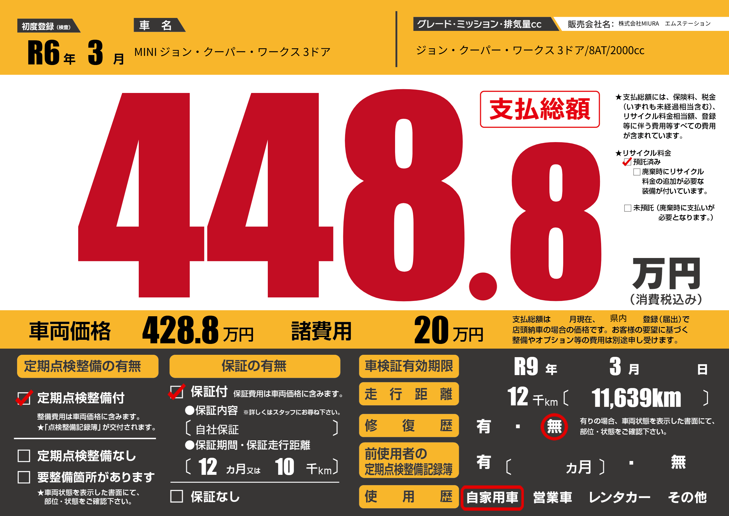 | 車名 | MINI ジョン・クーパー・ワークス 3ドア | グレード ミッション 排気量 |