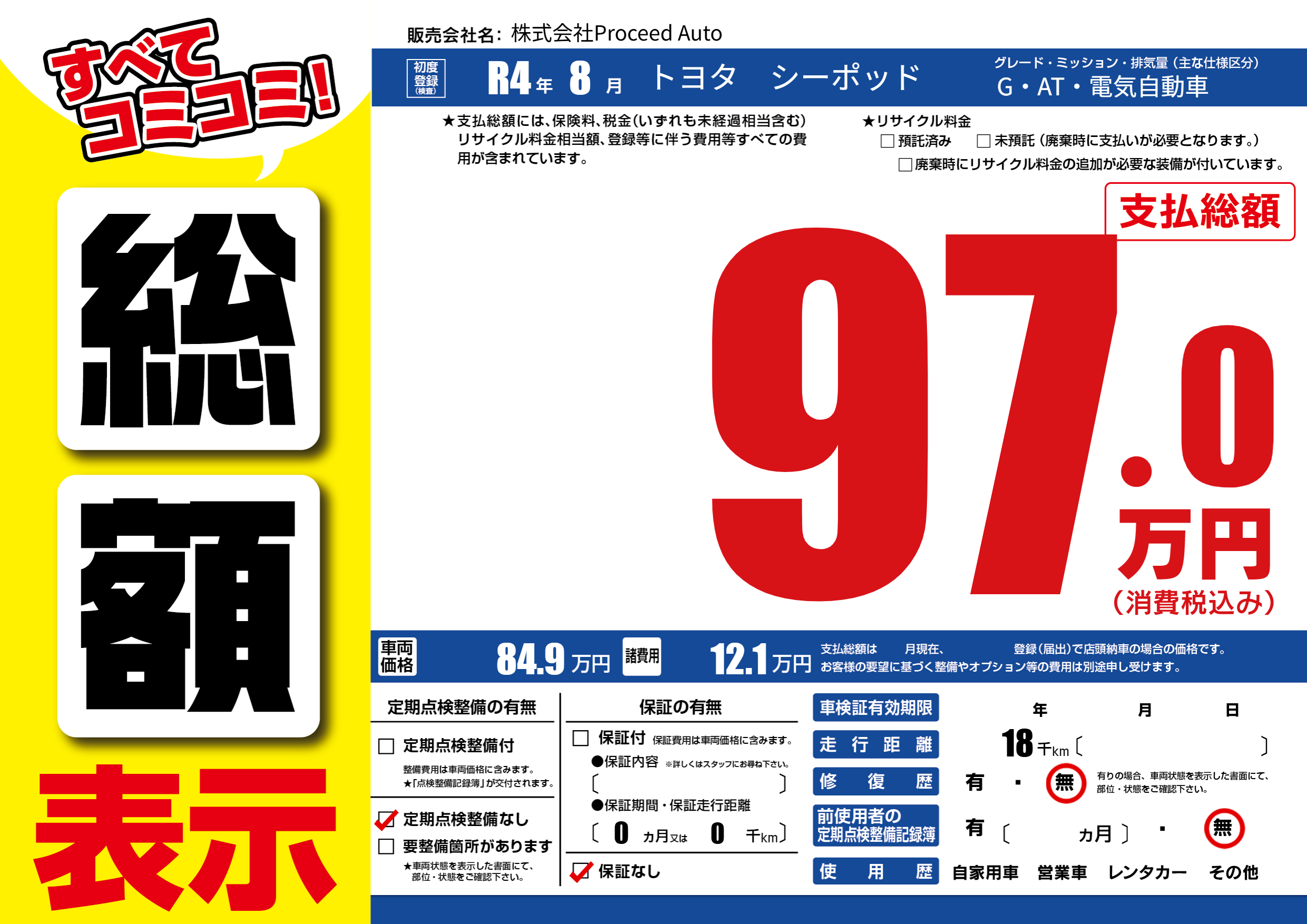| 車名 | トヨタ シーポッド | グレード ミッション 排気量 |