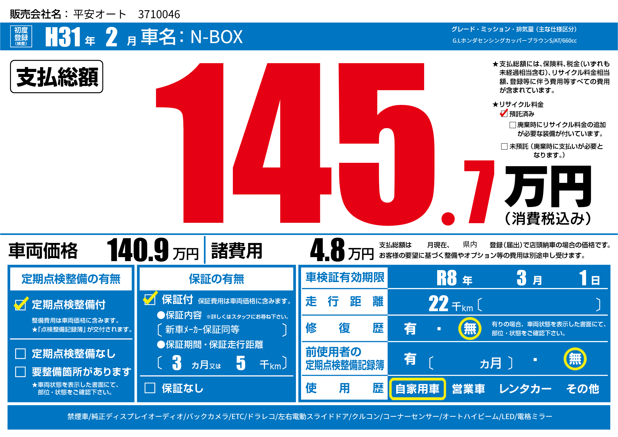 なし | 車検制限 | R8年3月1月 |
