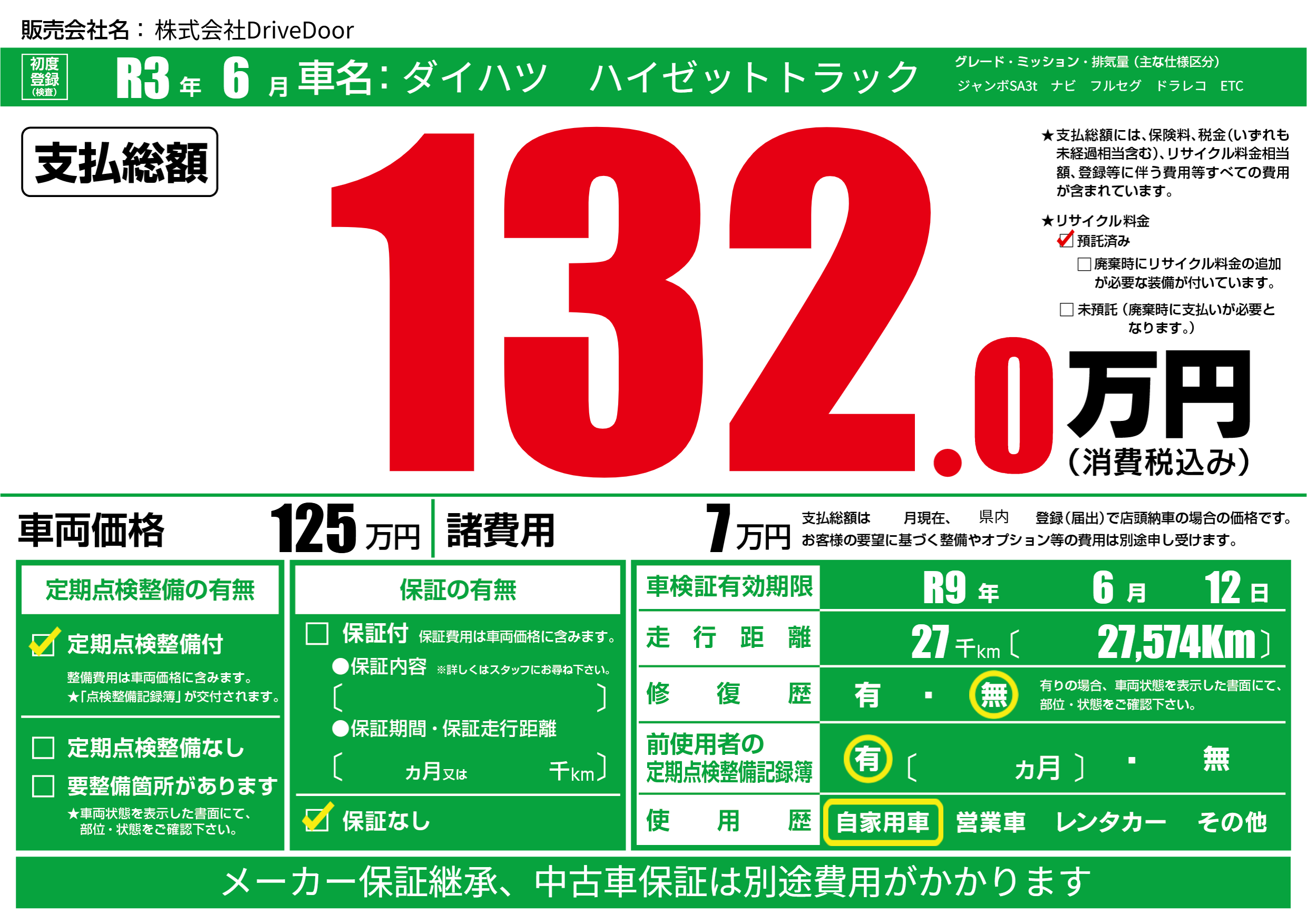 なし | 車検制限 | R9年6月12月 |