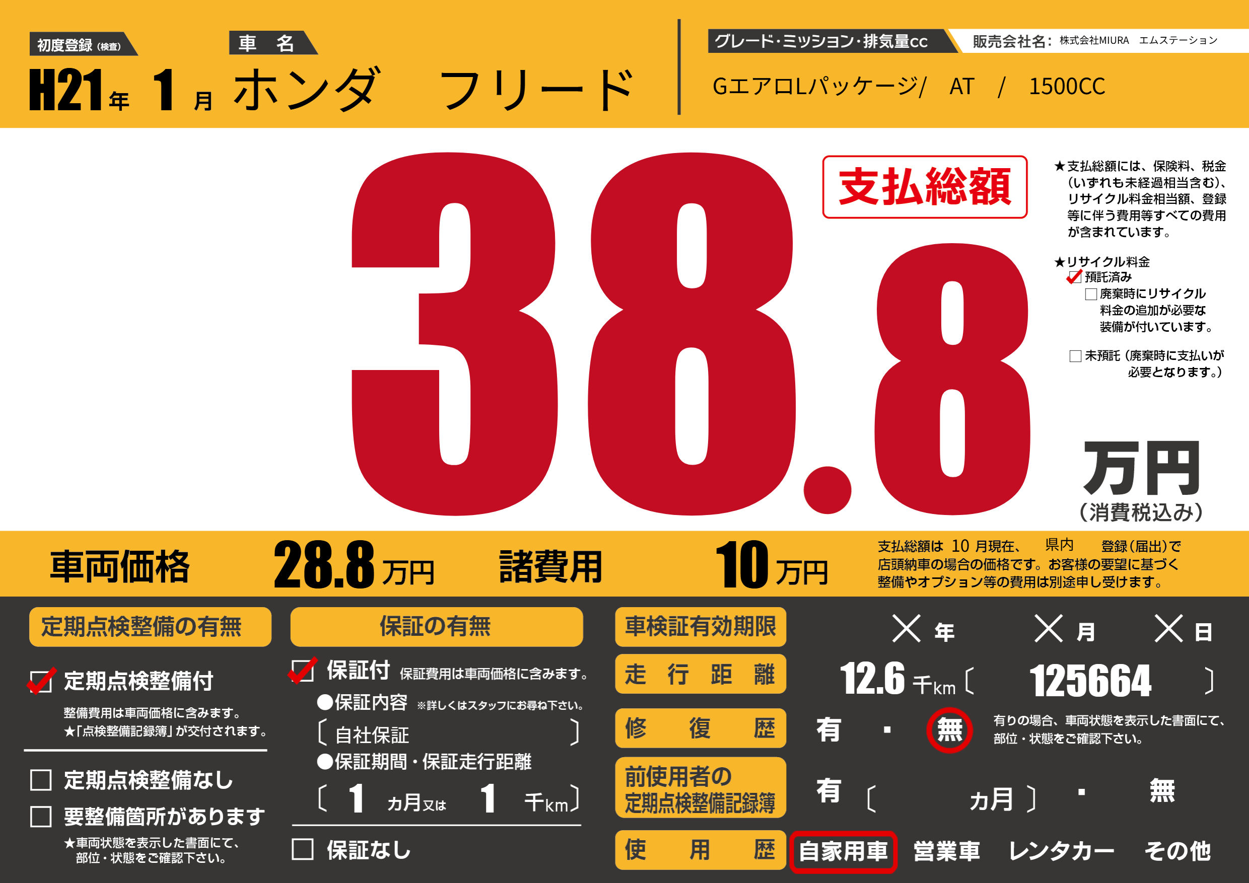 | 車名 | ホンダ フリード | グレード ミッション 排気量 |