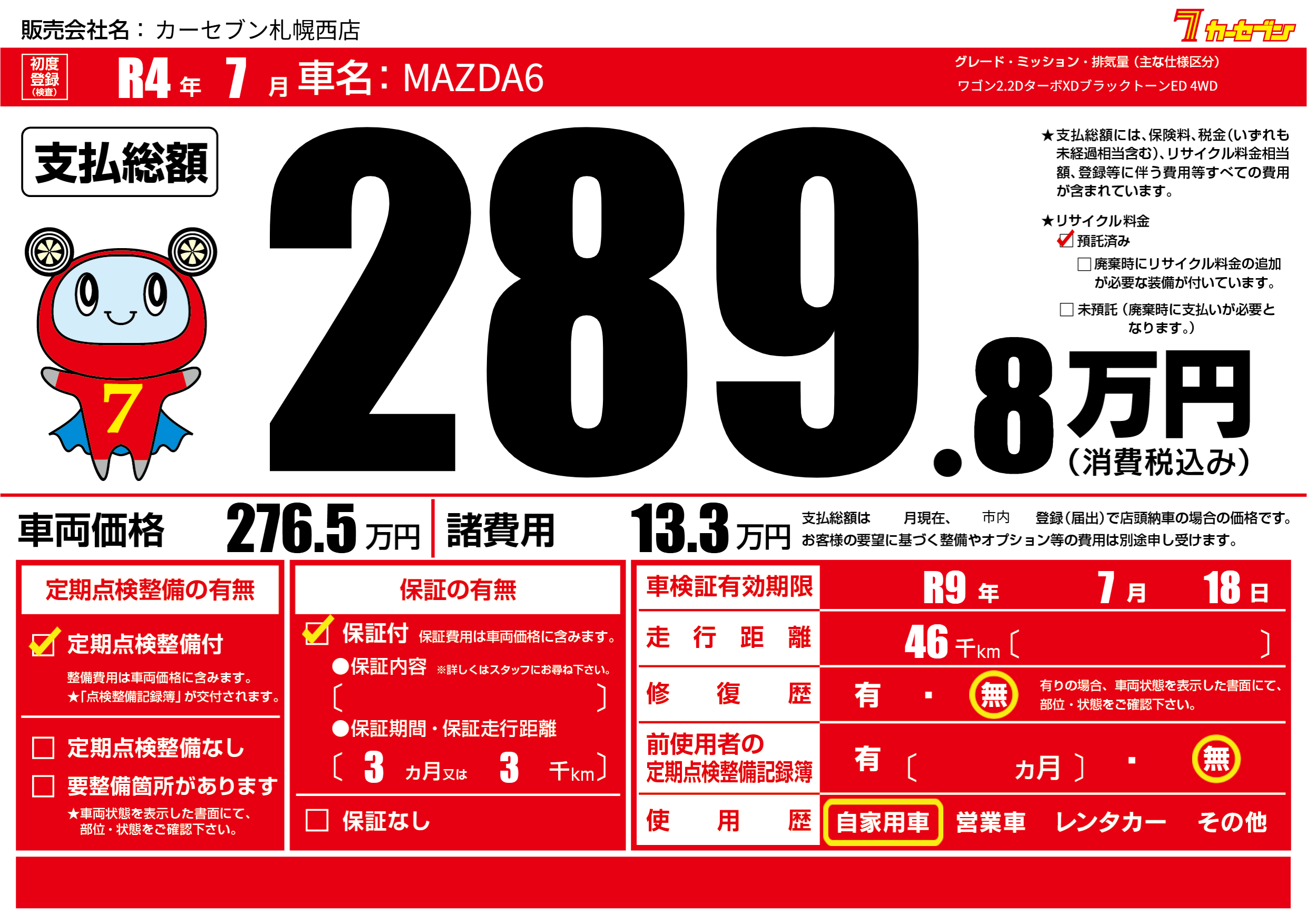 | 車検制限 | R9年 7月 18日 | ||