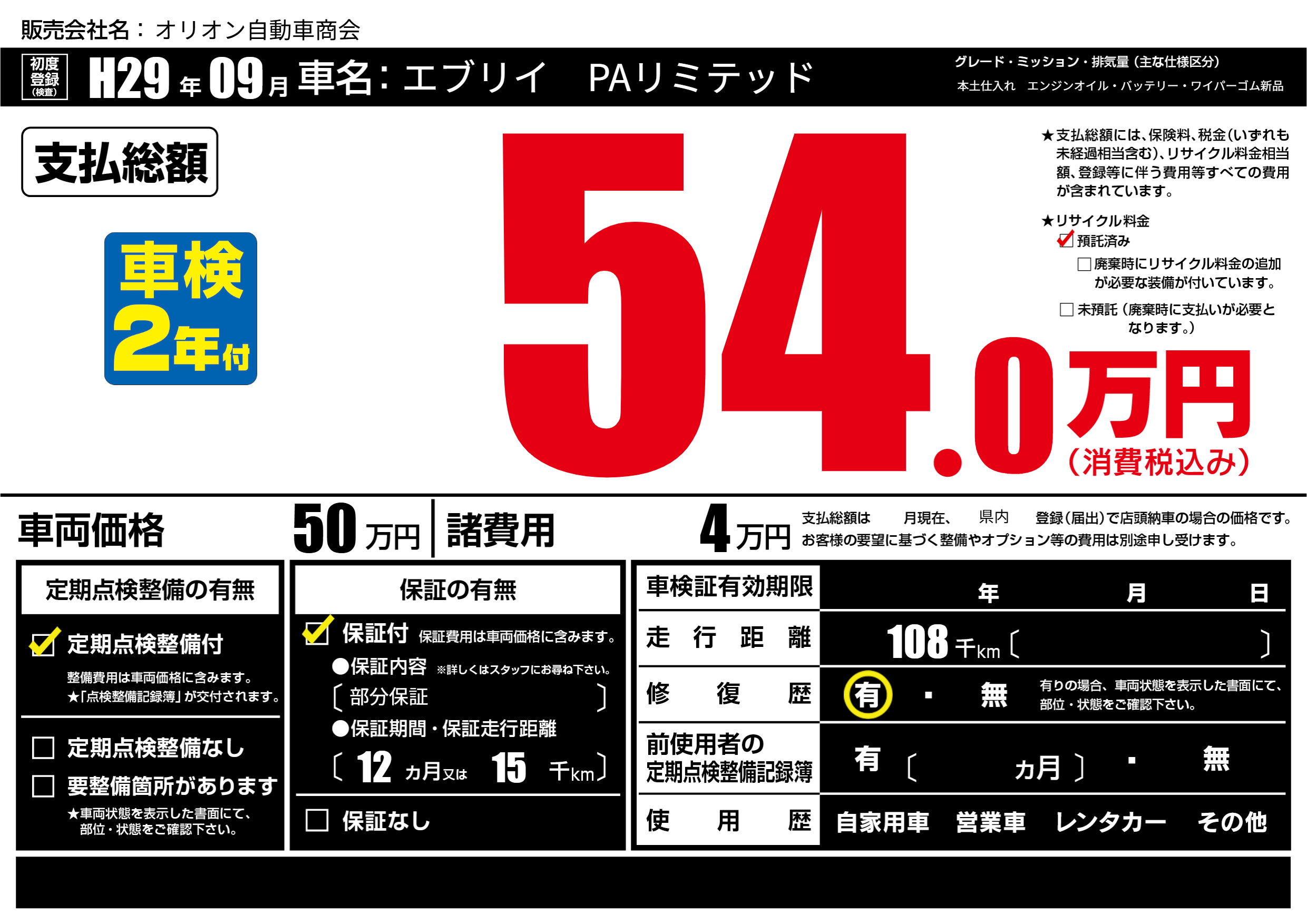 | 車名 | エブリイ PAリミテッド | グレード ミッション 排気量 |