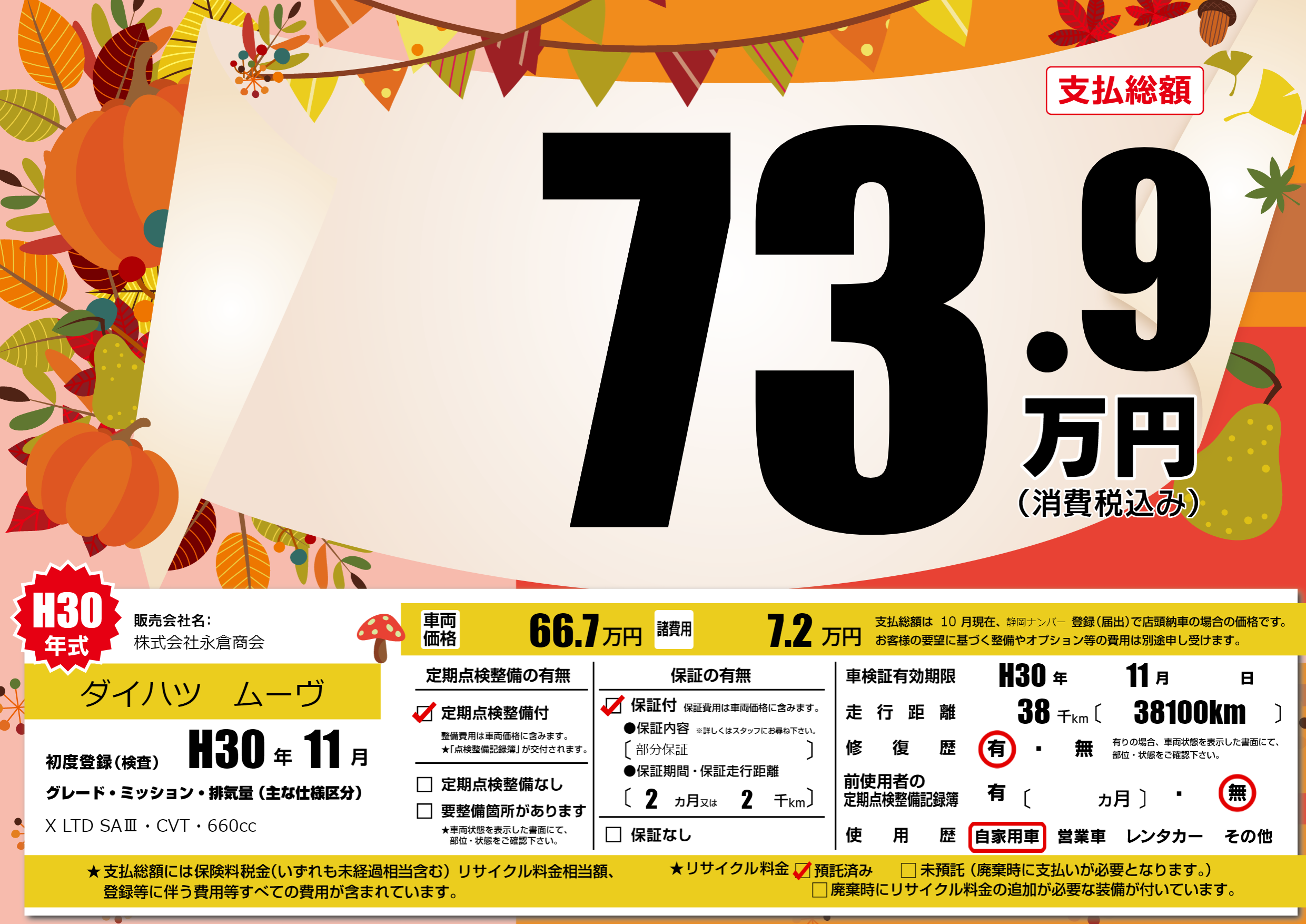 | 走行キロ | 3.8万km | 初年度登録 | H30年11月 |