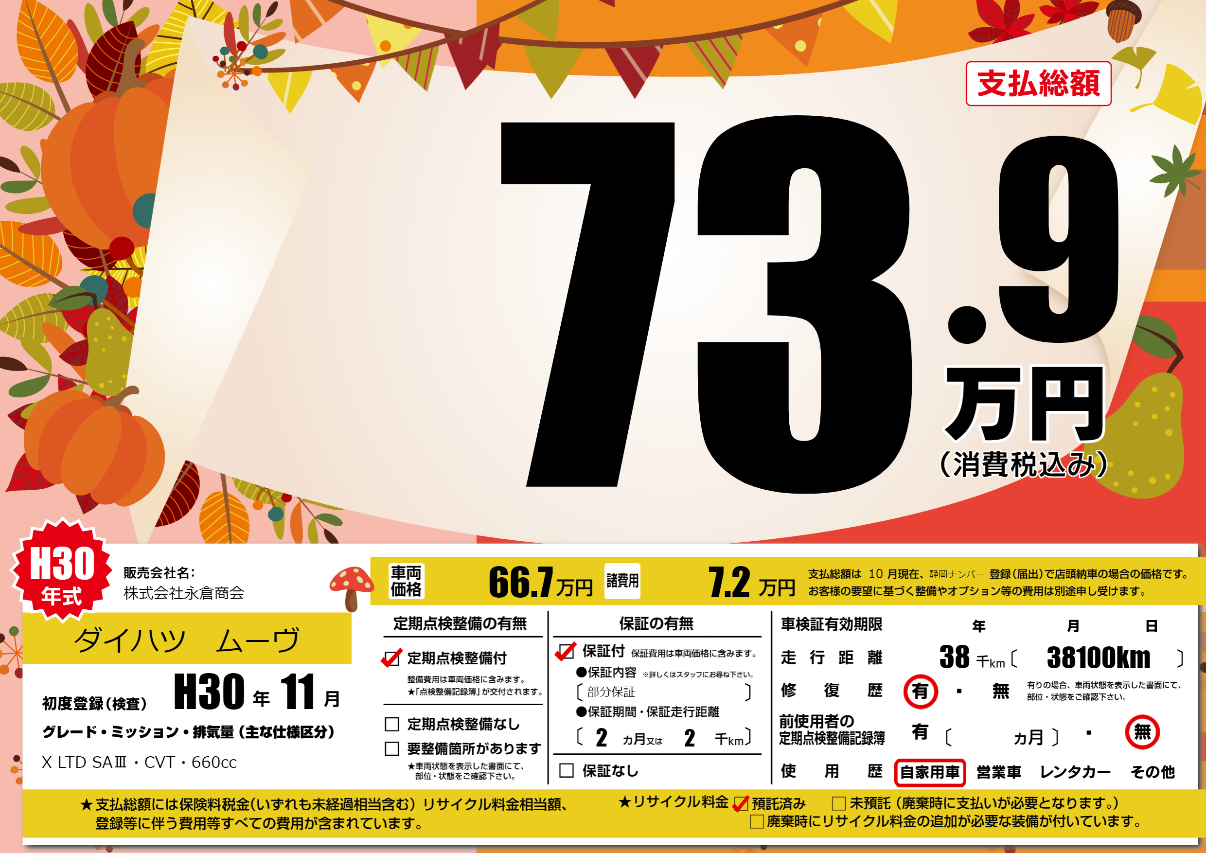 | 走行キロ | 3.8万km | 初年度登録 | H30年11月 |