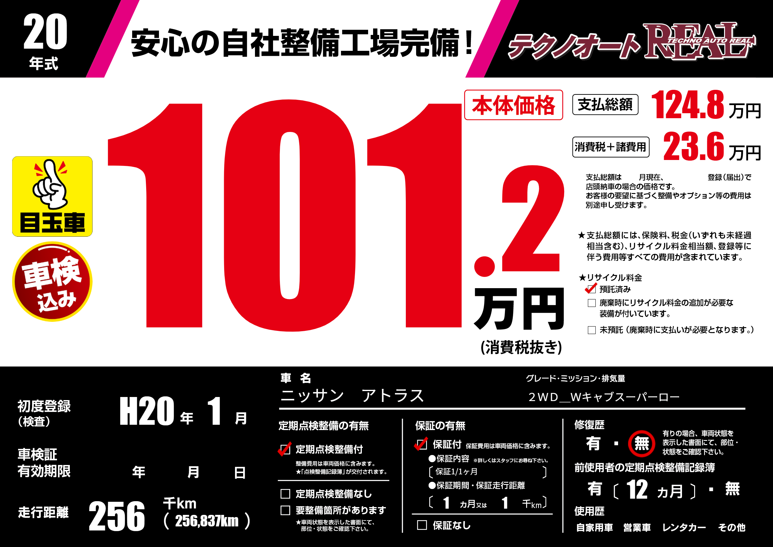 | 走行キロ | 25.6万km | 初年度登録 | H20年1月 |