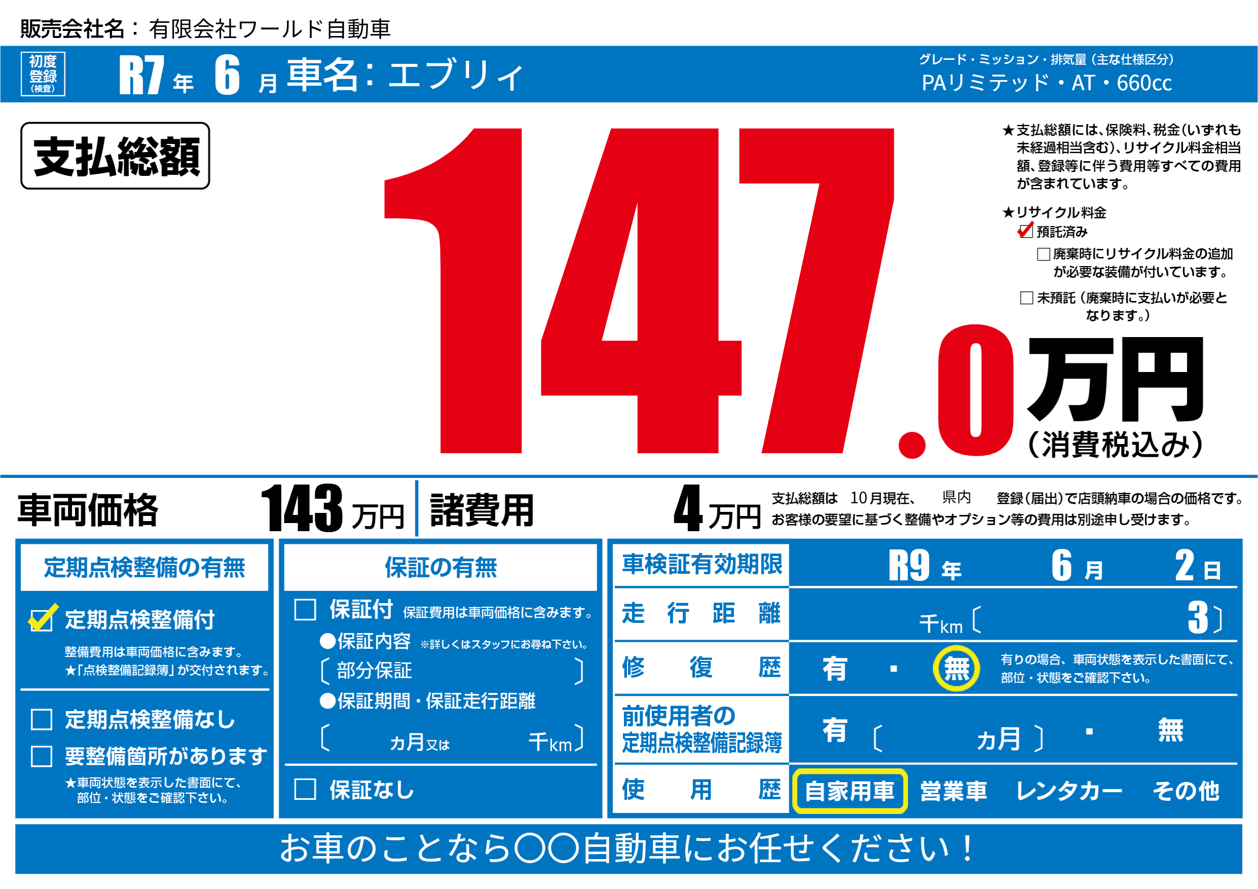 | 車名 | エブリィ | グレード ミッション 排気量 |