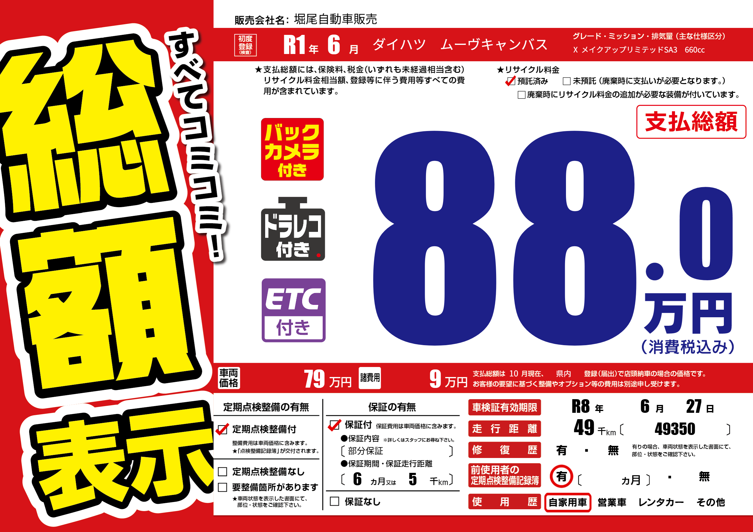 | 走行キロ | 4.9万km | 初年度登録 | R1年6月 |