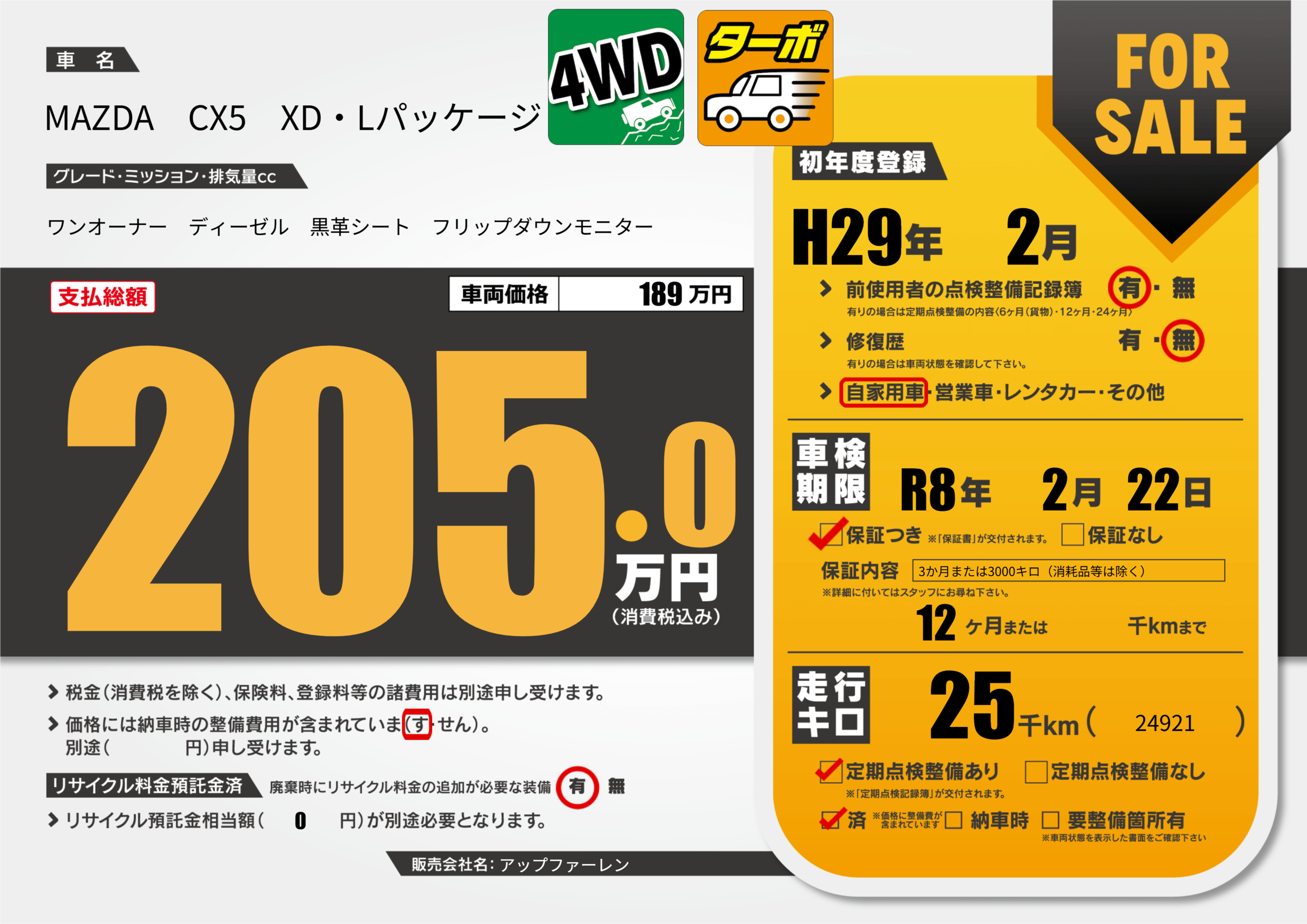 | 車名 | MAZDA CX5 XD・Lパッケージ | グレード ミッション 排気量 |