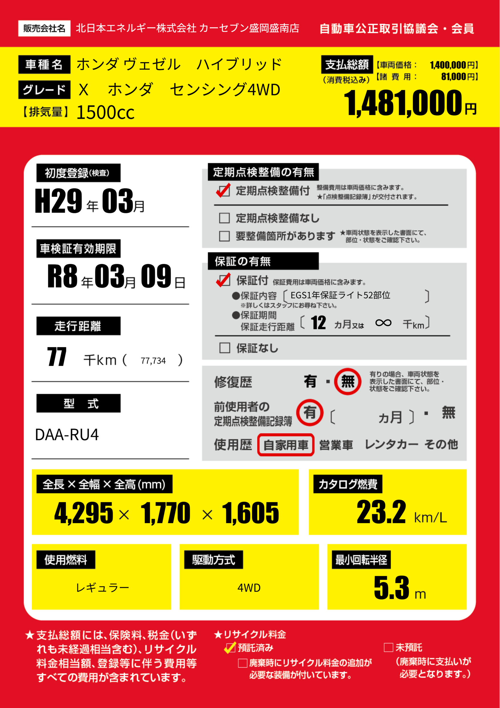 | 車名 | ホンダ ヴェゼル ハイブリッド | グレード ミッション 排気量 |