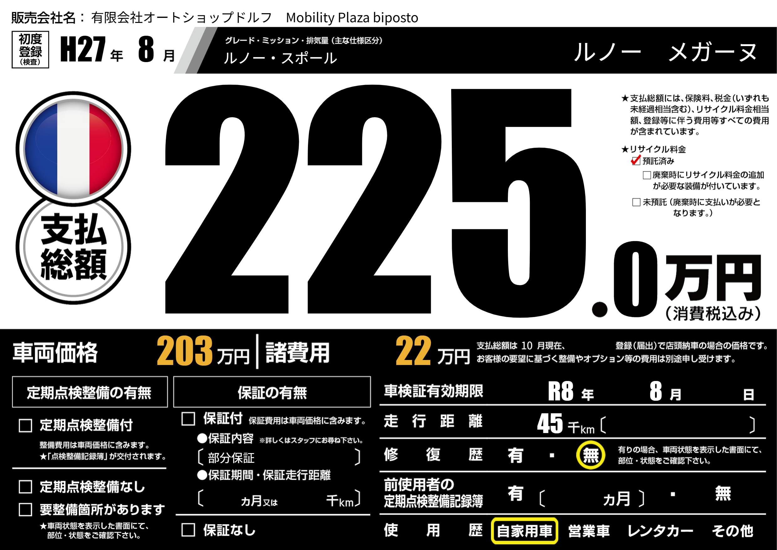 | 走行キロ | 4.5万km | 初年度登録 | H27年8月 |