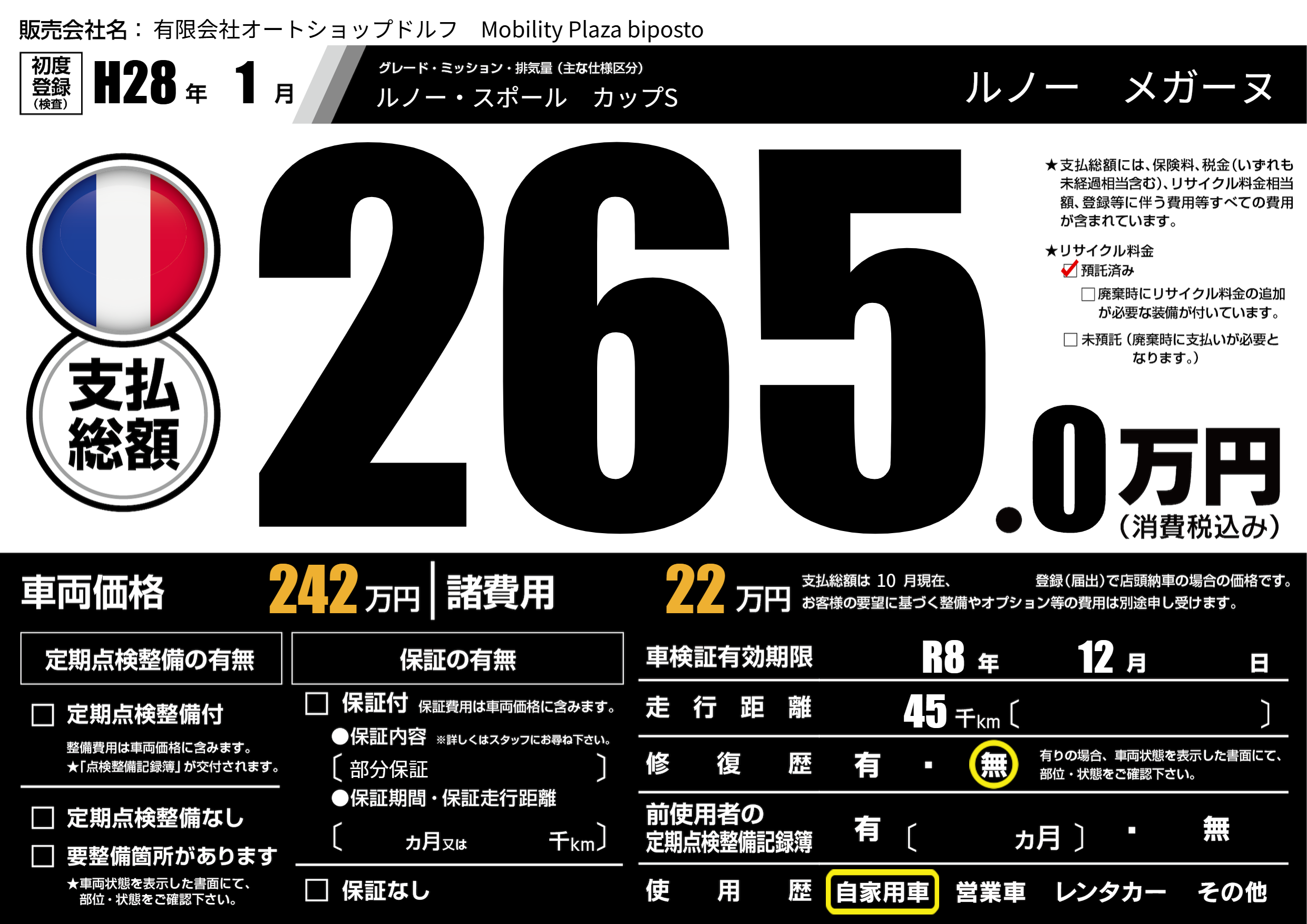 | 車名 | ルノー メガーヌ | グレード ミッション 排気量 |