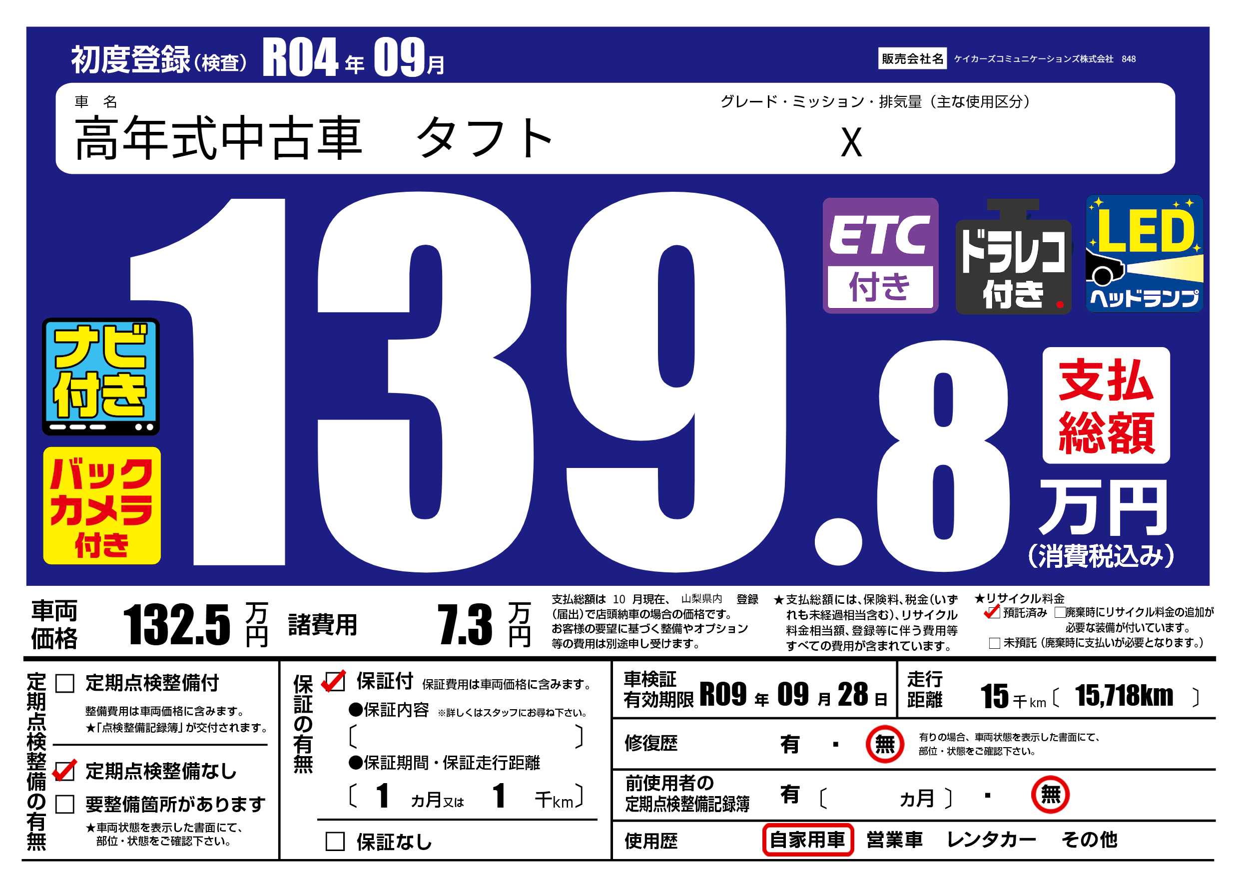 | 走行キロ | 1.5万km | 初年度登録 | R04年09月 |