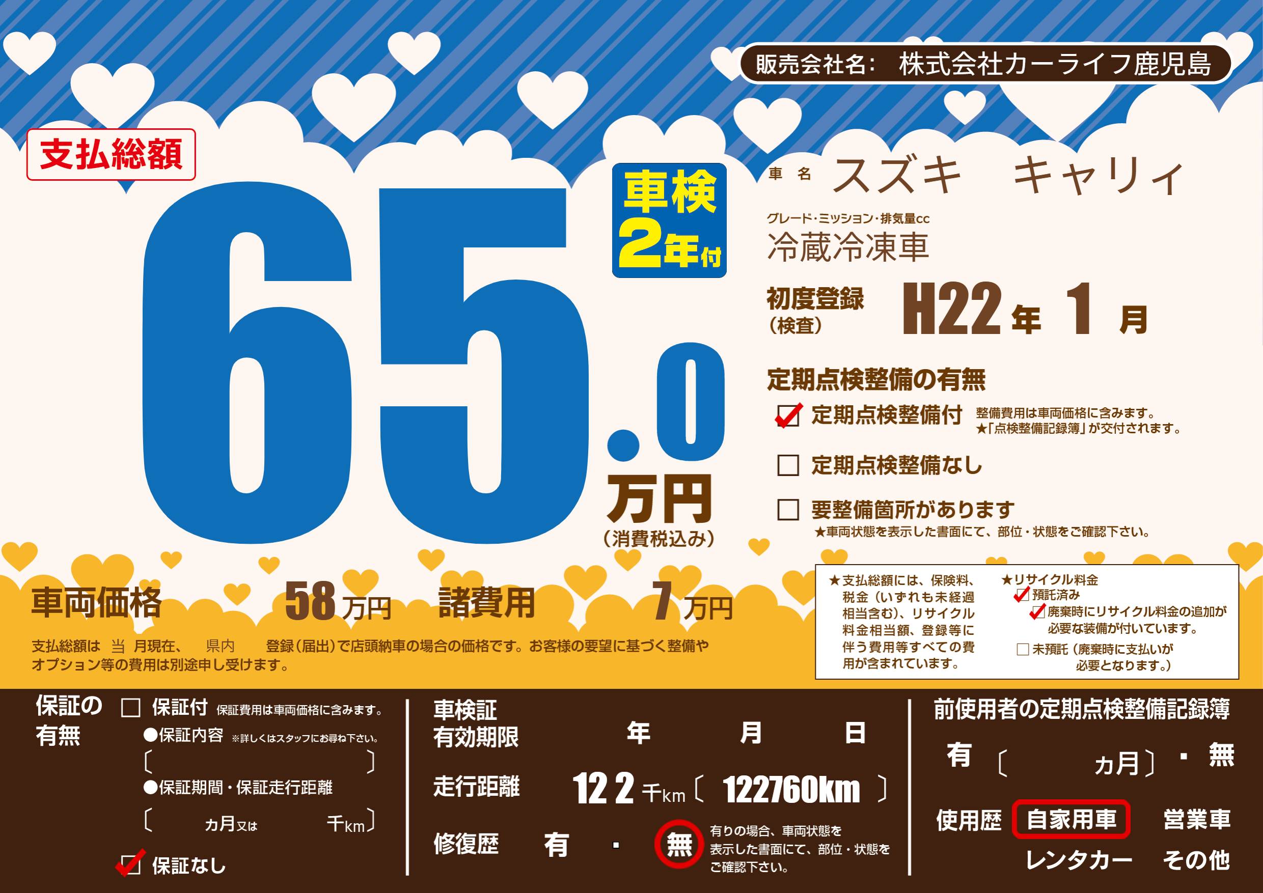 | 走行キロ | 1.2万km | 初年度登録 | H22年1月 |