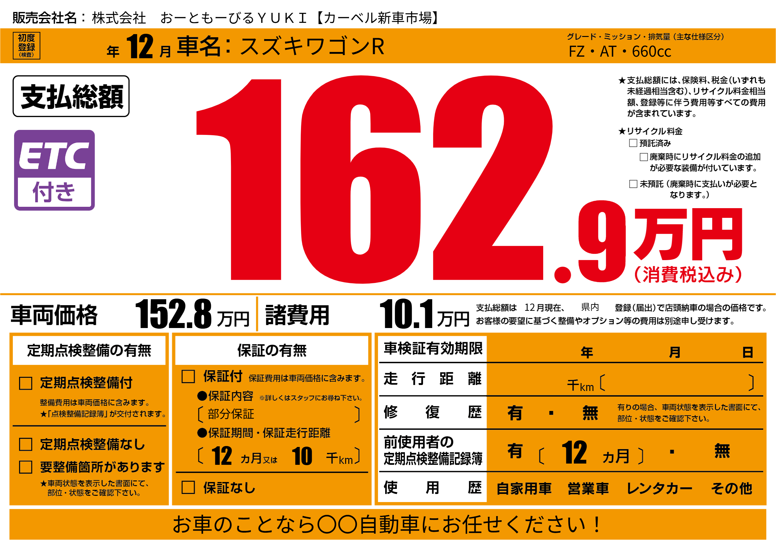 | 車名 | スズキワゴンR | グレード ミッション 排気量 |