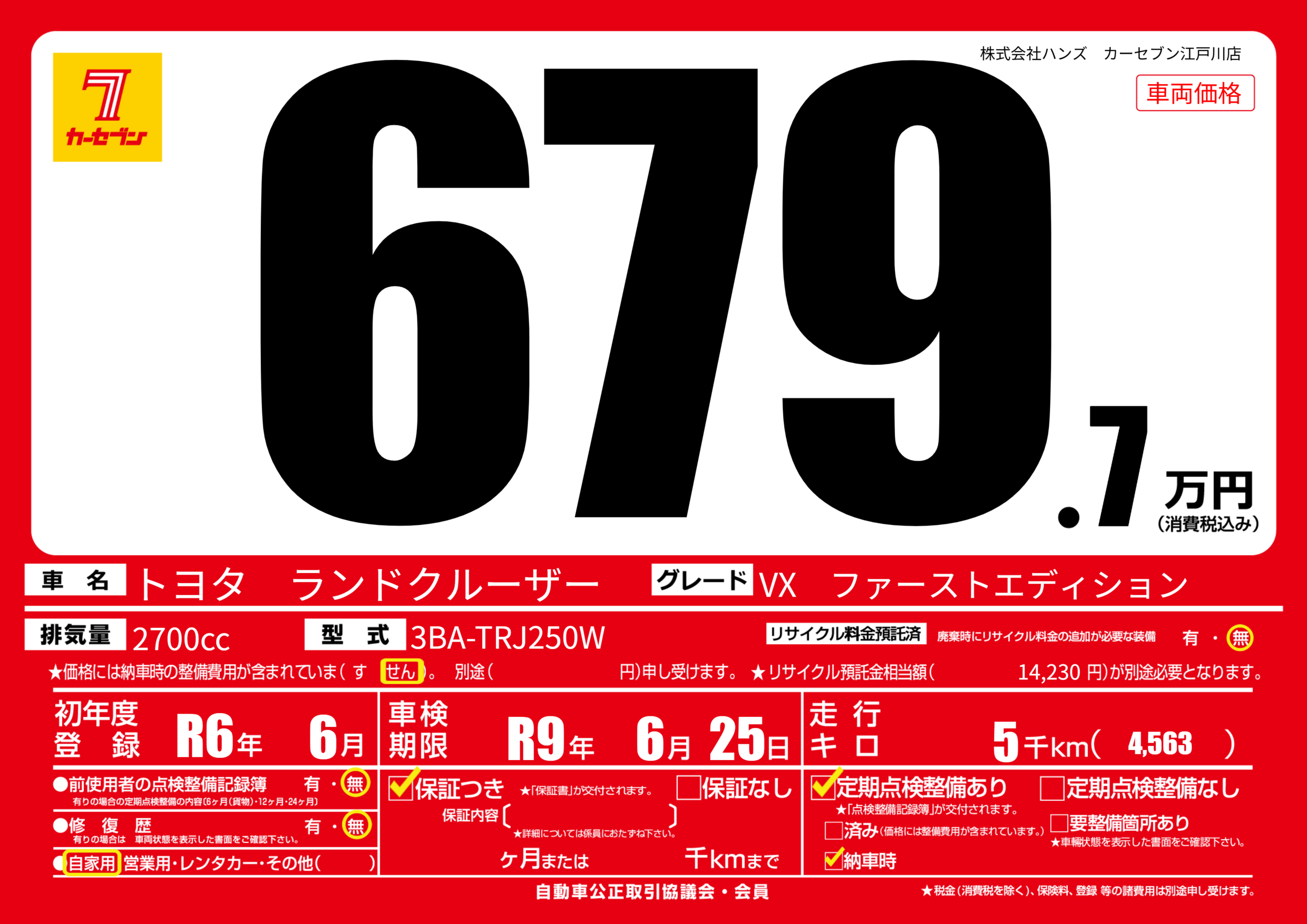| 走行キロ | 0.5万km | 初年度登録 | R6年6月 |