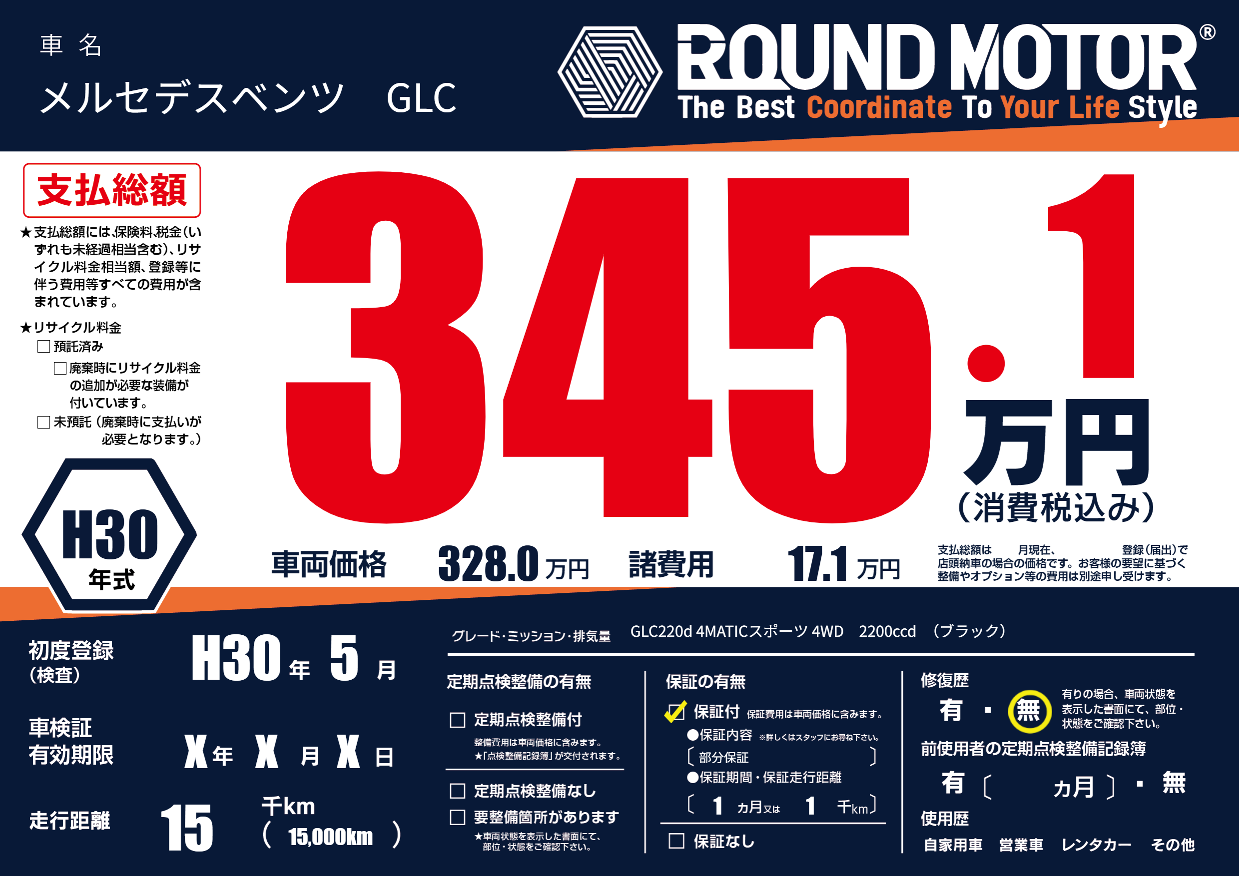 | 車名 | メルセデスベンツ GLC | グレード ミッション 排気量 |