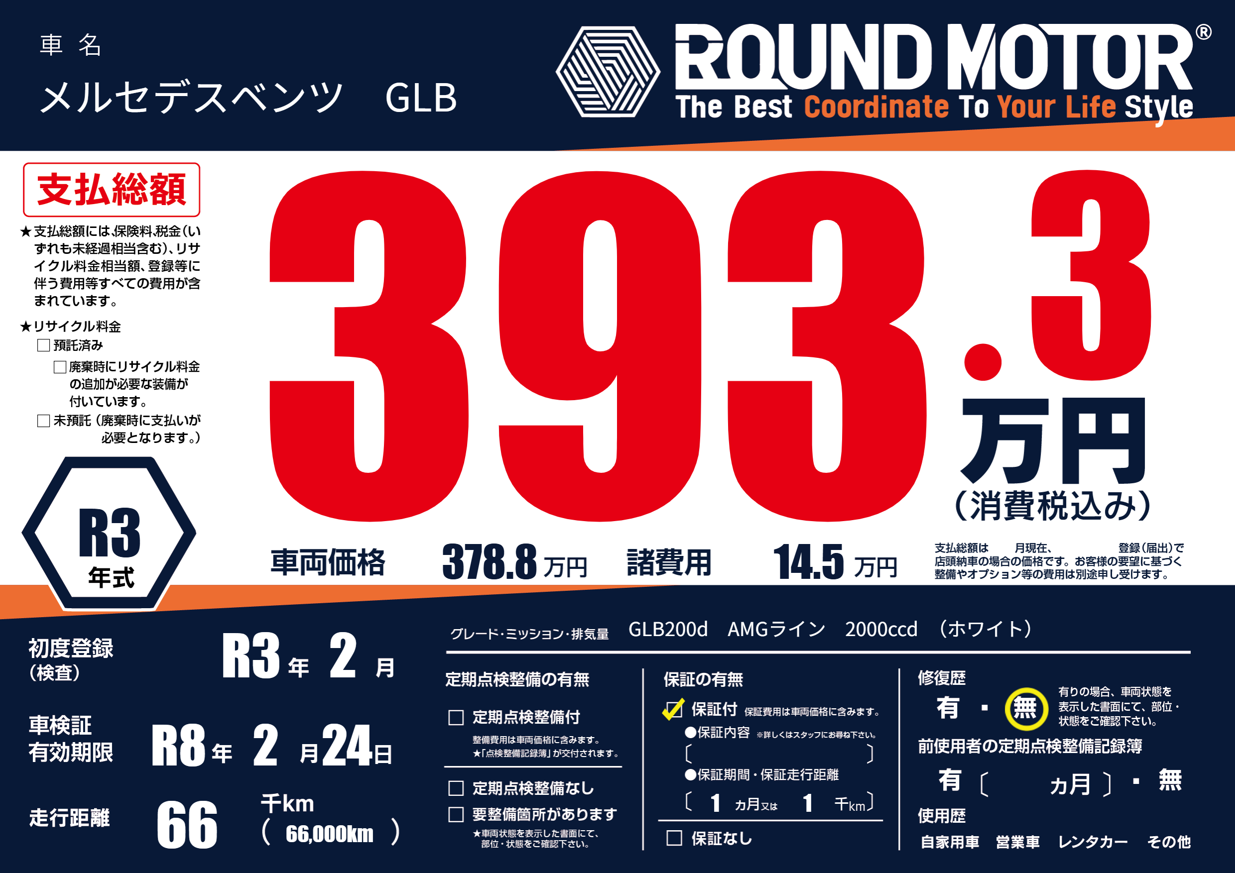 | 車名 | メルセデスベンツ GLB | グレード ミッション 排気量 |