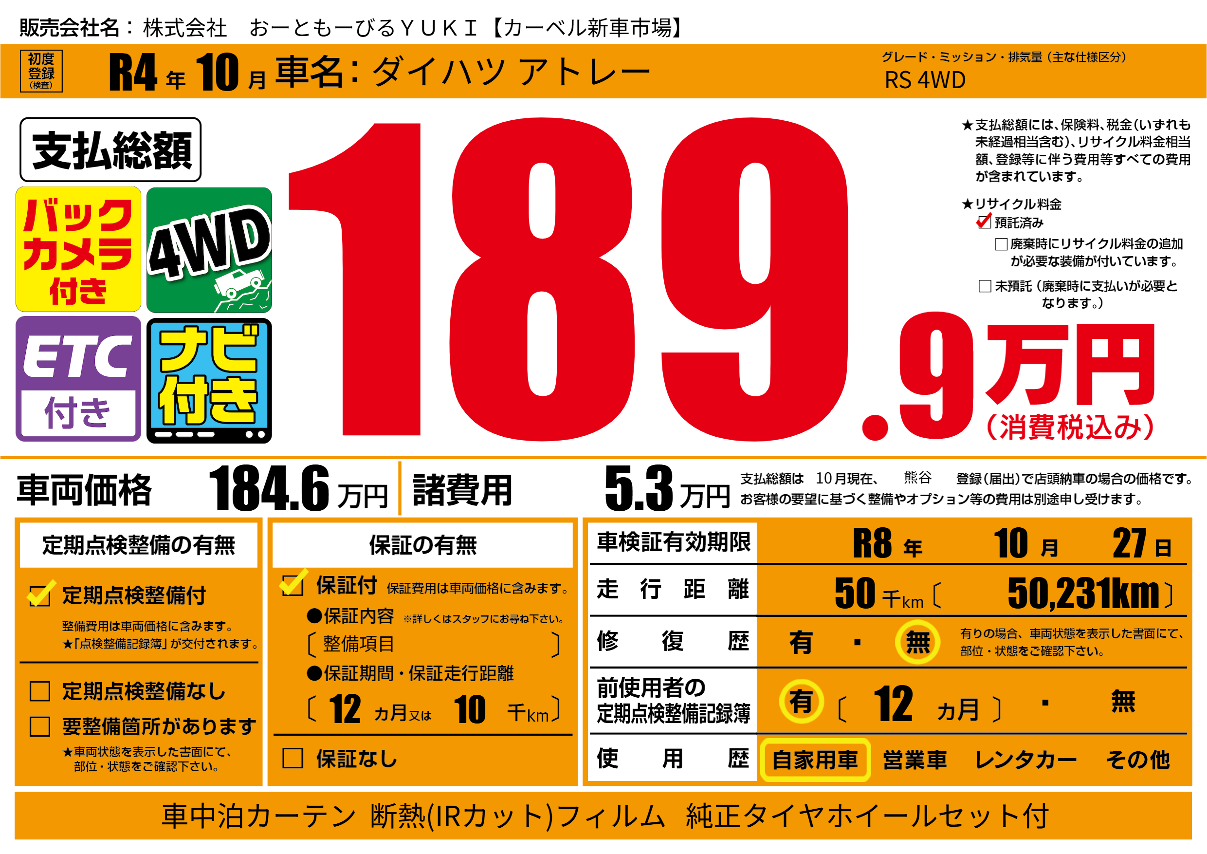 | 走行キロ | 5万km | 初年度登録 | R4年10月 |