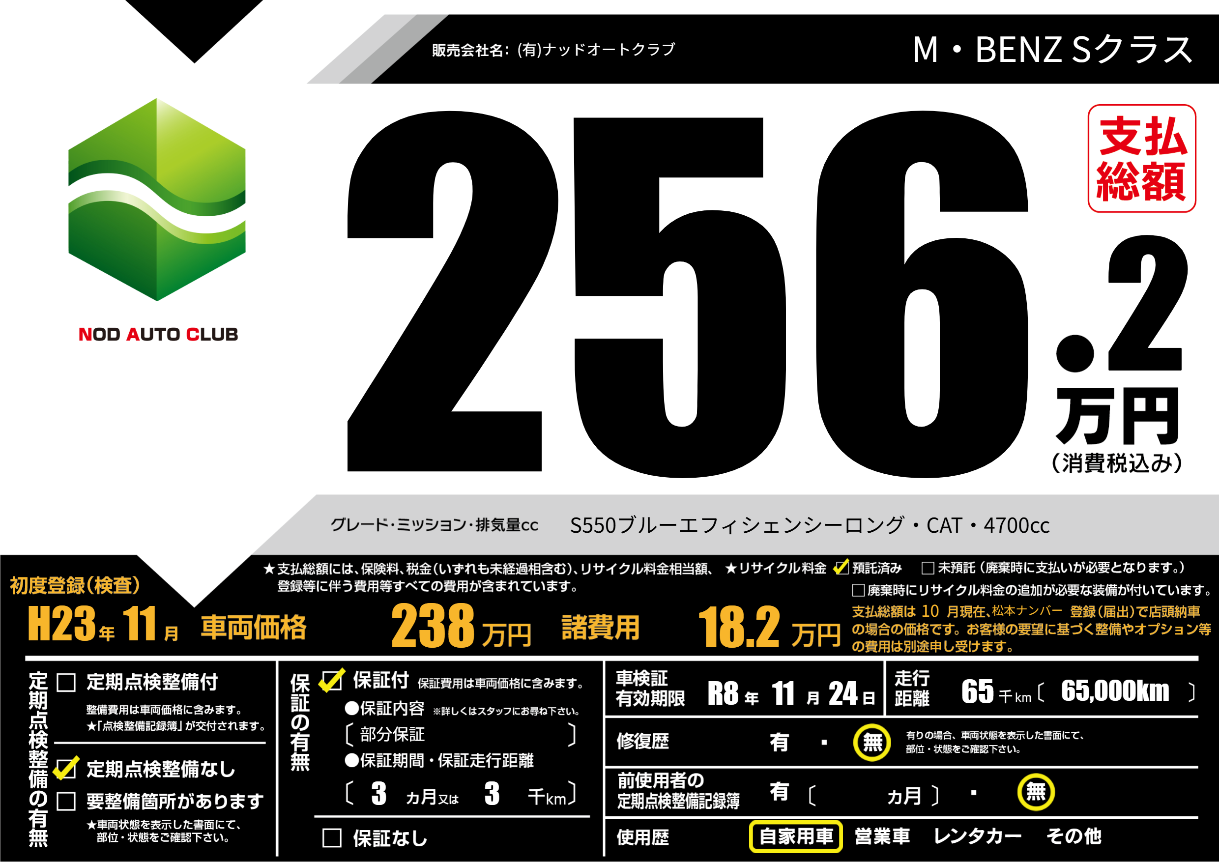 | 車名 | M・BENZ Sクラス | グレード ミッション 排気量 |