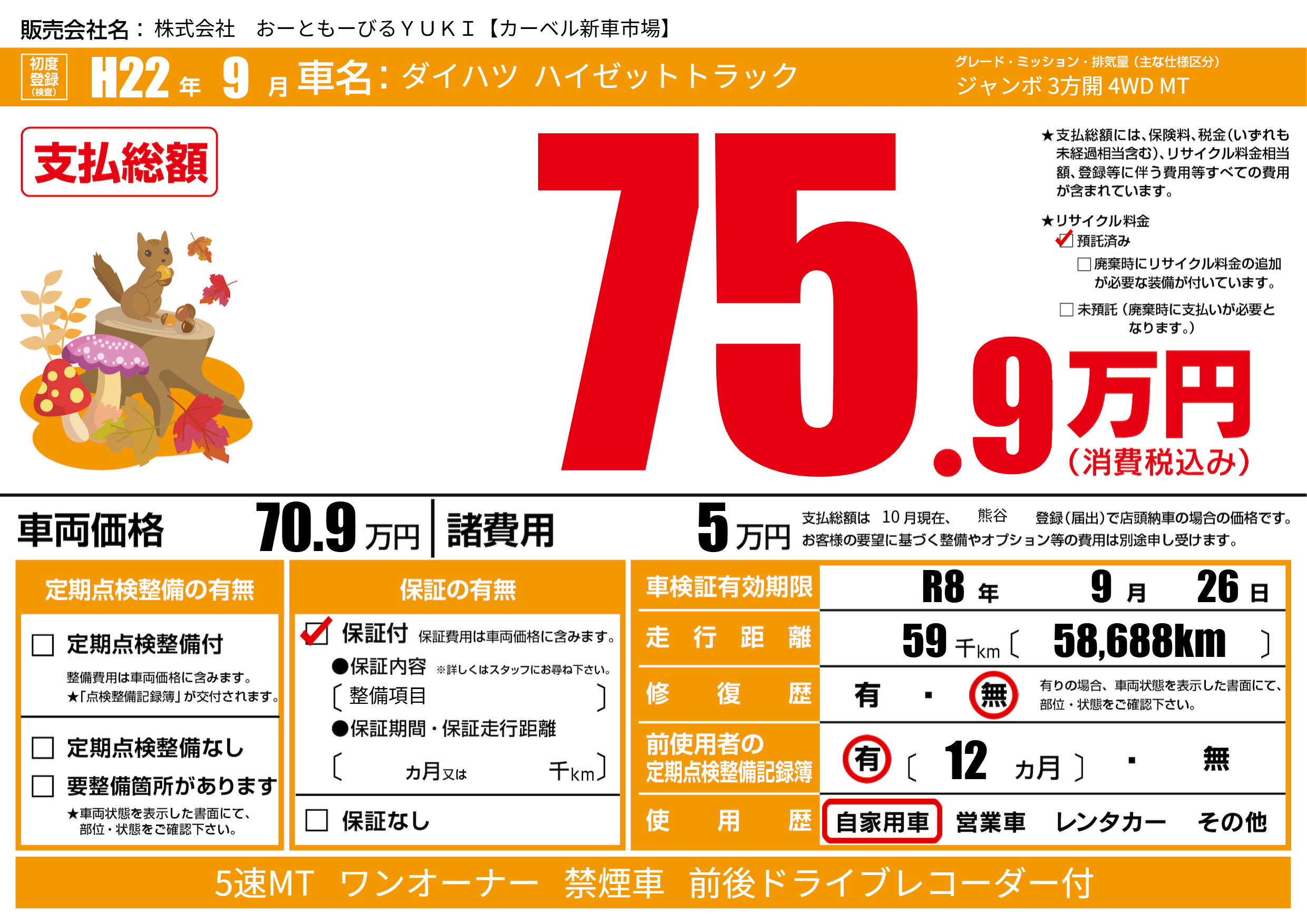 | 走行キロ | 5.9万km | 初年度登録 | H22年9月 |