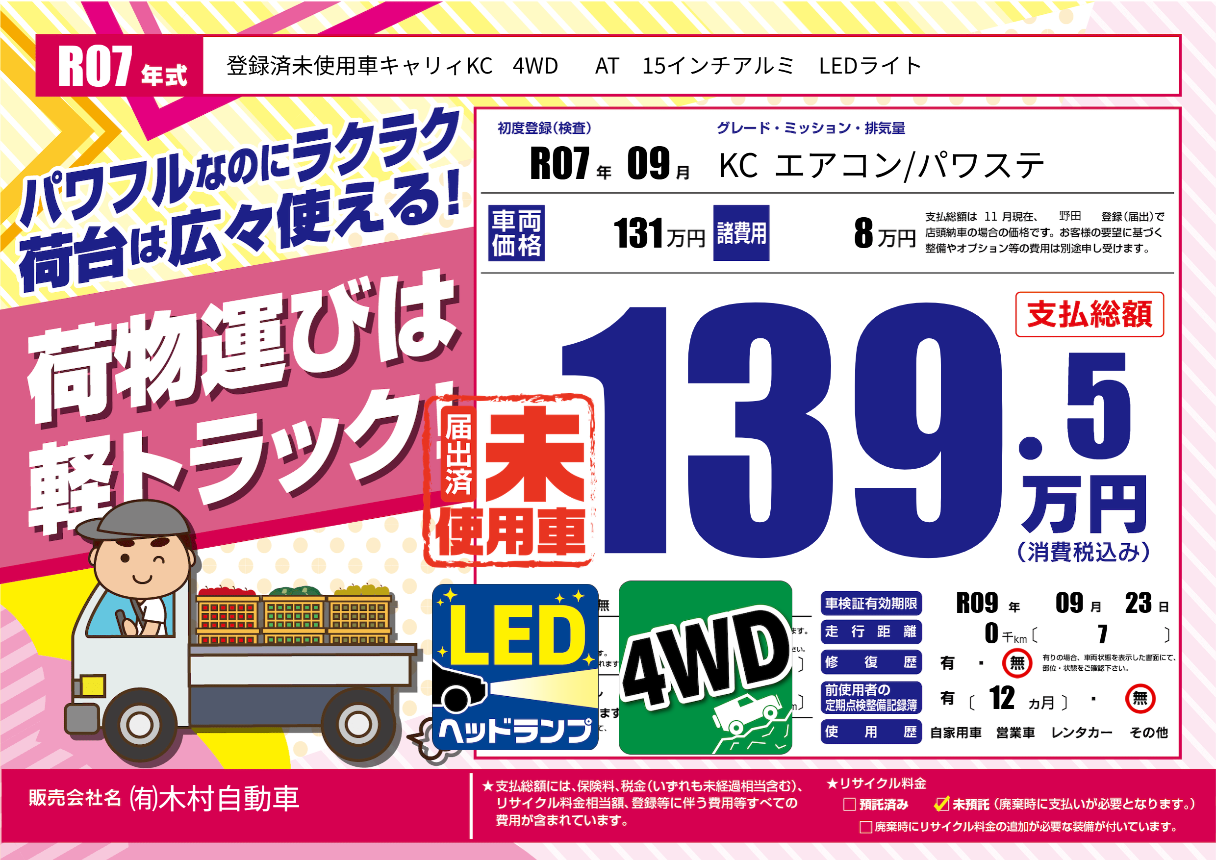 登録済未使用車キャリィKC 4WD AT 15インチアルミ LEDライト