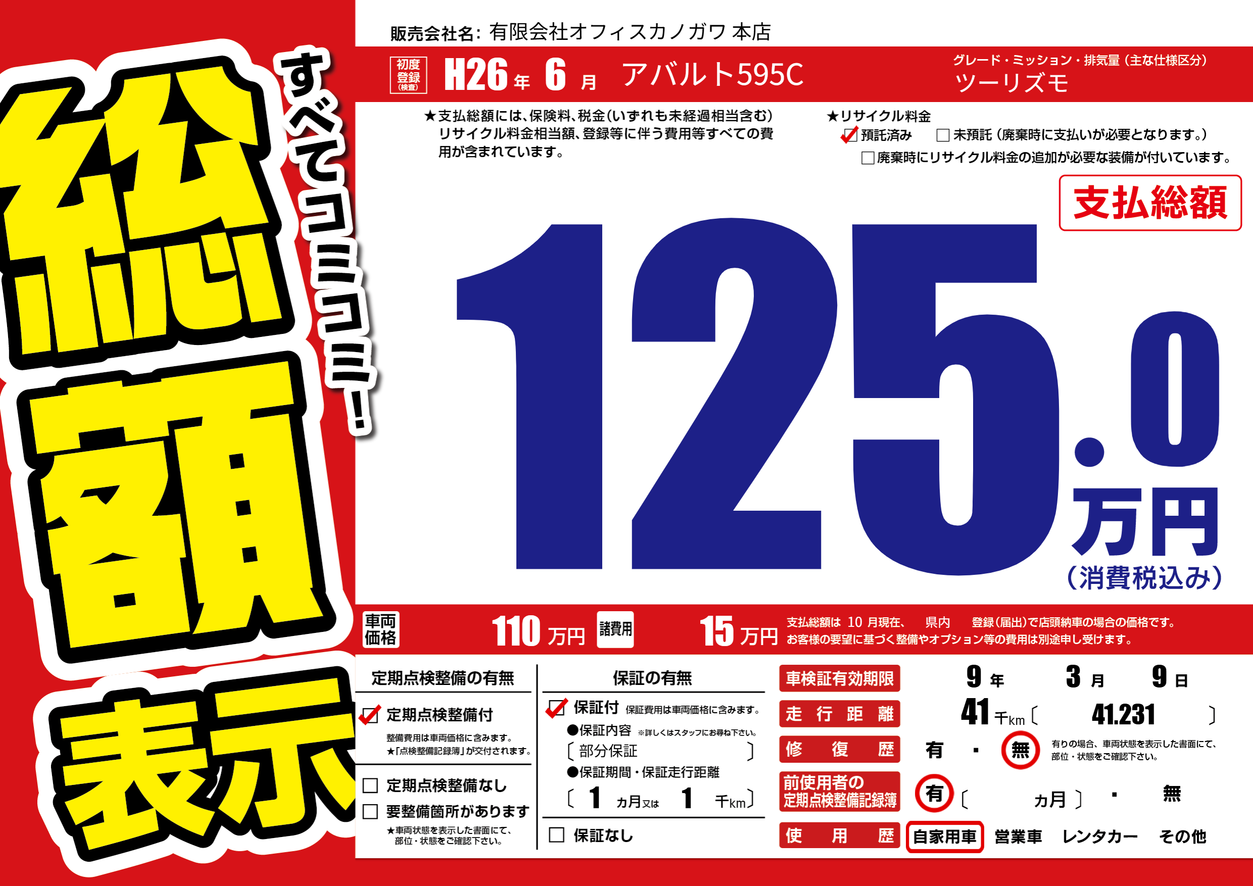 | 走行キロ | 4.1万km | 初年度登録 | H26年6月 |