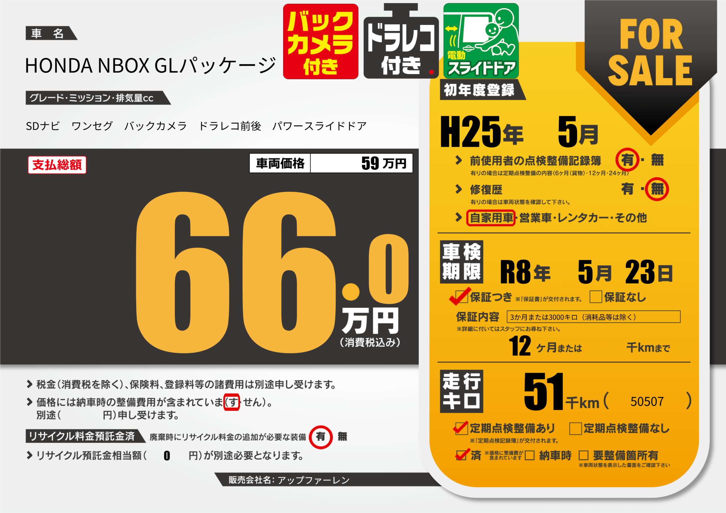 | 車名 | HONDA NBOX GLパッケージ | グレード ミッション 排気量 |