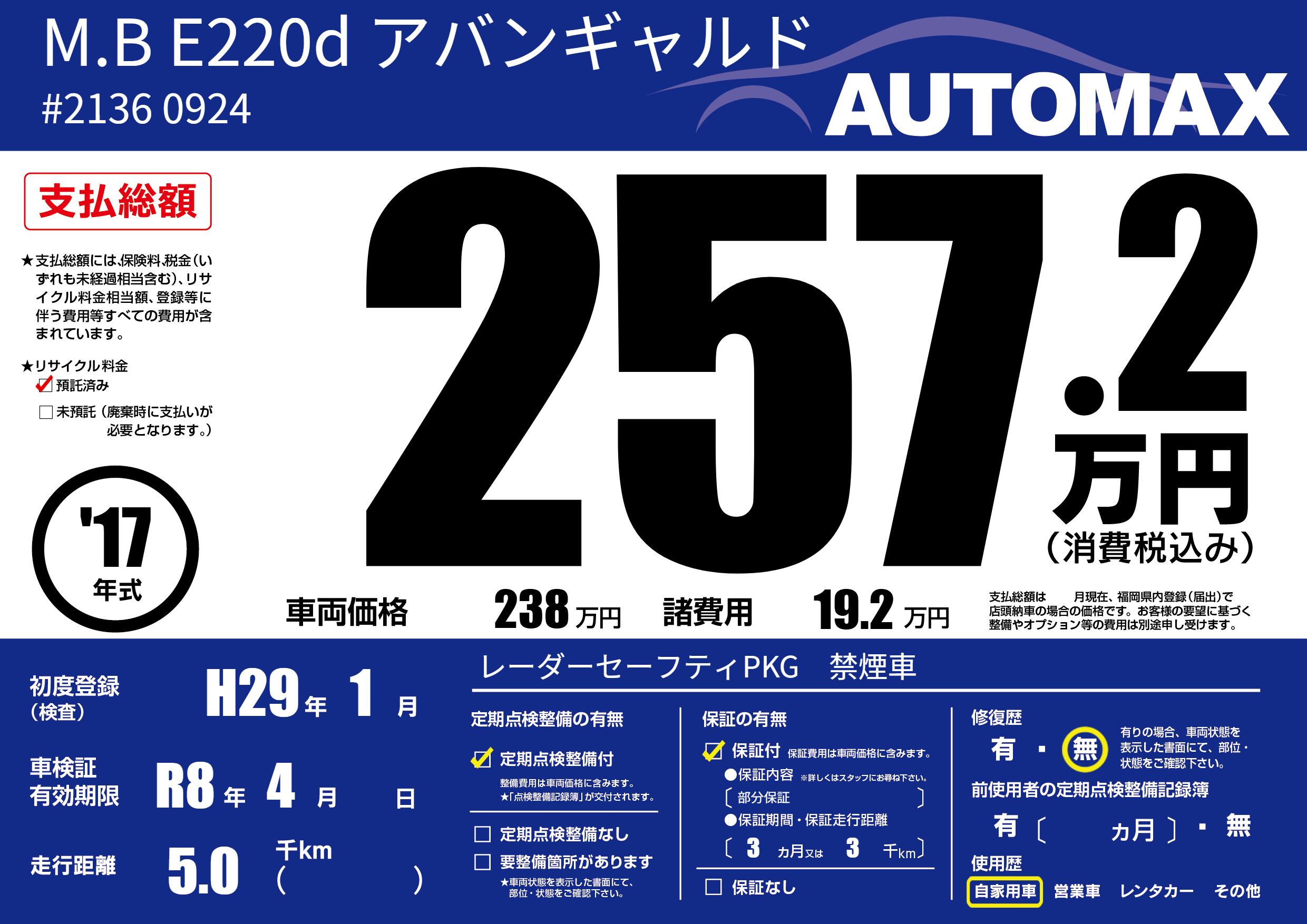 | 車名 | M.B E220d アバンギャルド | グレード ミッション 排気量 |