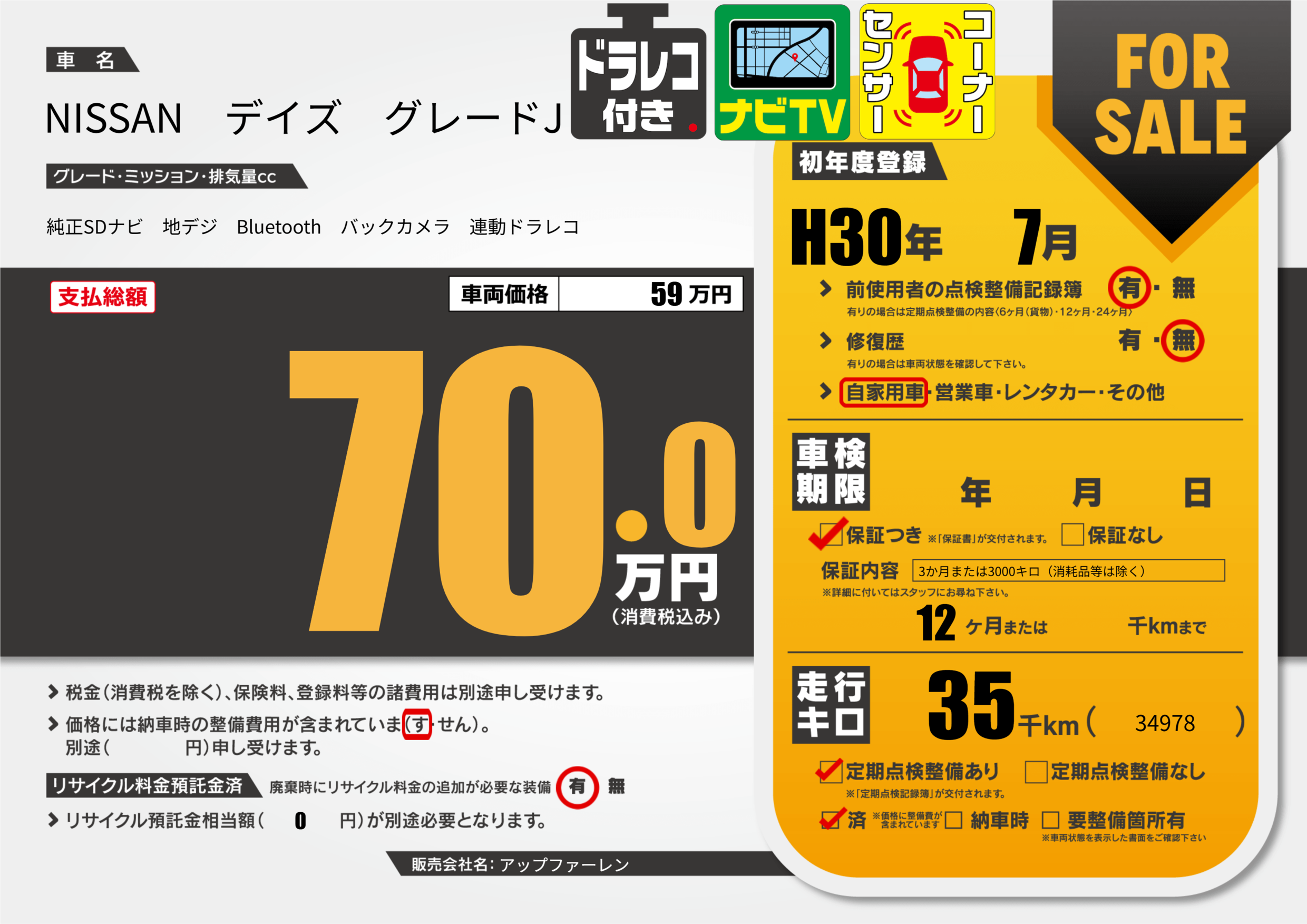 | 定期点検整備 | 定期点検整備あり 定期点検整備済み | ||