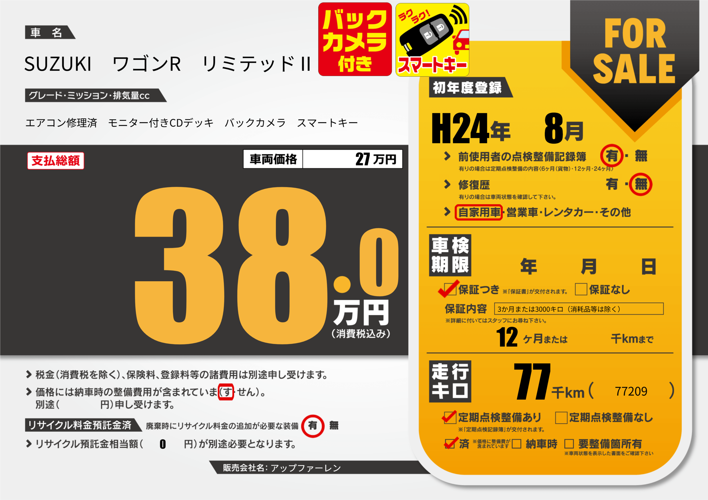 | 定期点検整備 | 定期点検整備あり 定期点検整備済み | ||