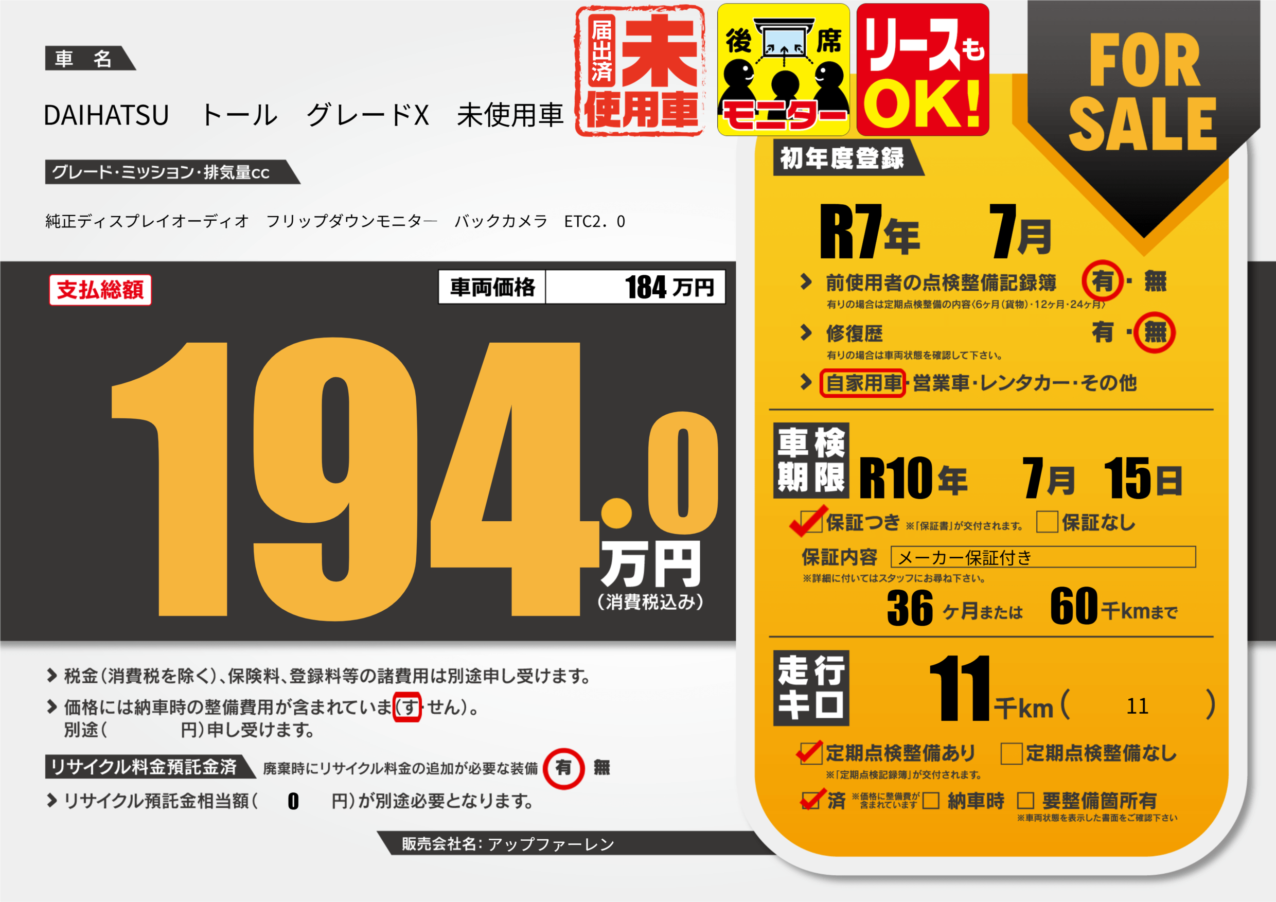 | 車名 | DAIHATSU トール グレードX 未使用車 | グレード ミッション 排気量 |