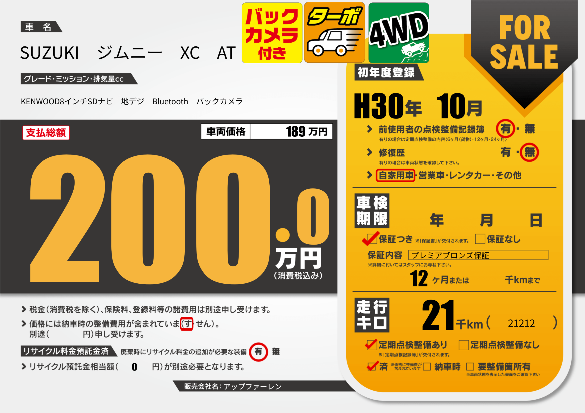 | 車名 | SUZUKI ジムニー XC AT | グレード ミッション 排気量 |