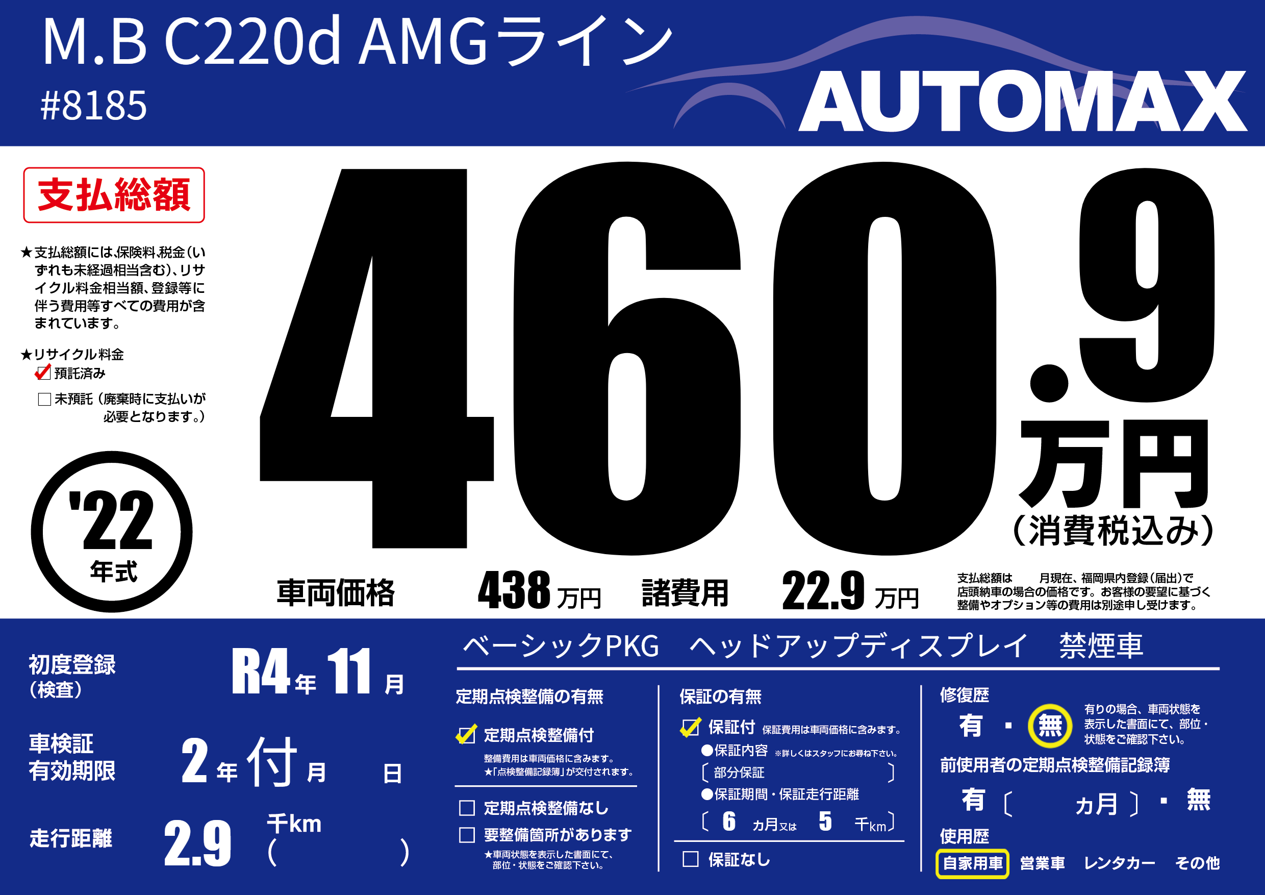 | 車名 | M.B C220d AMGライン | グレード ミッション 排気量 |