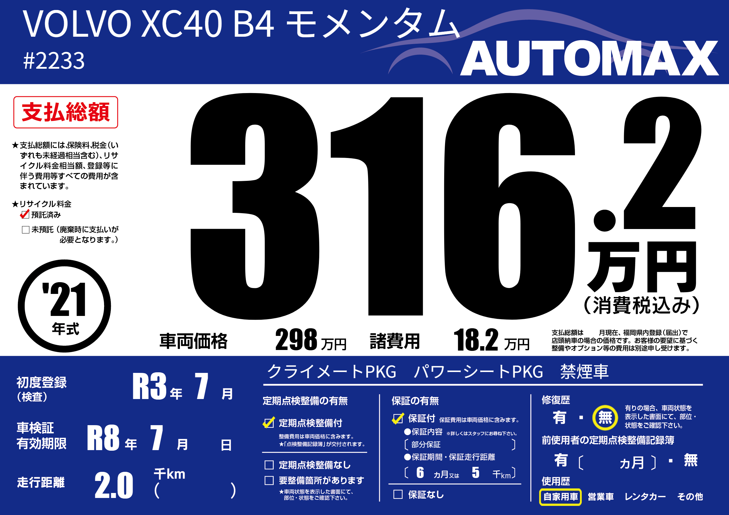 | 車名 | VOLVO XC40 B4 モメンタム | グレード ミッション 排気量 |