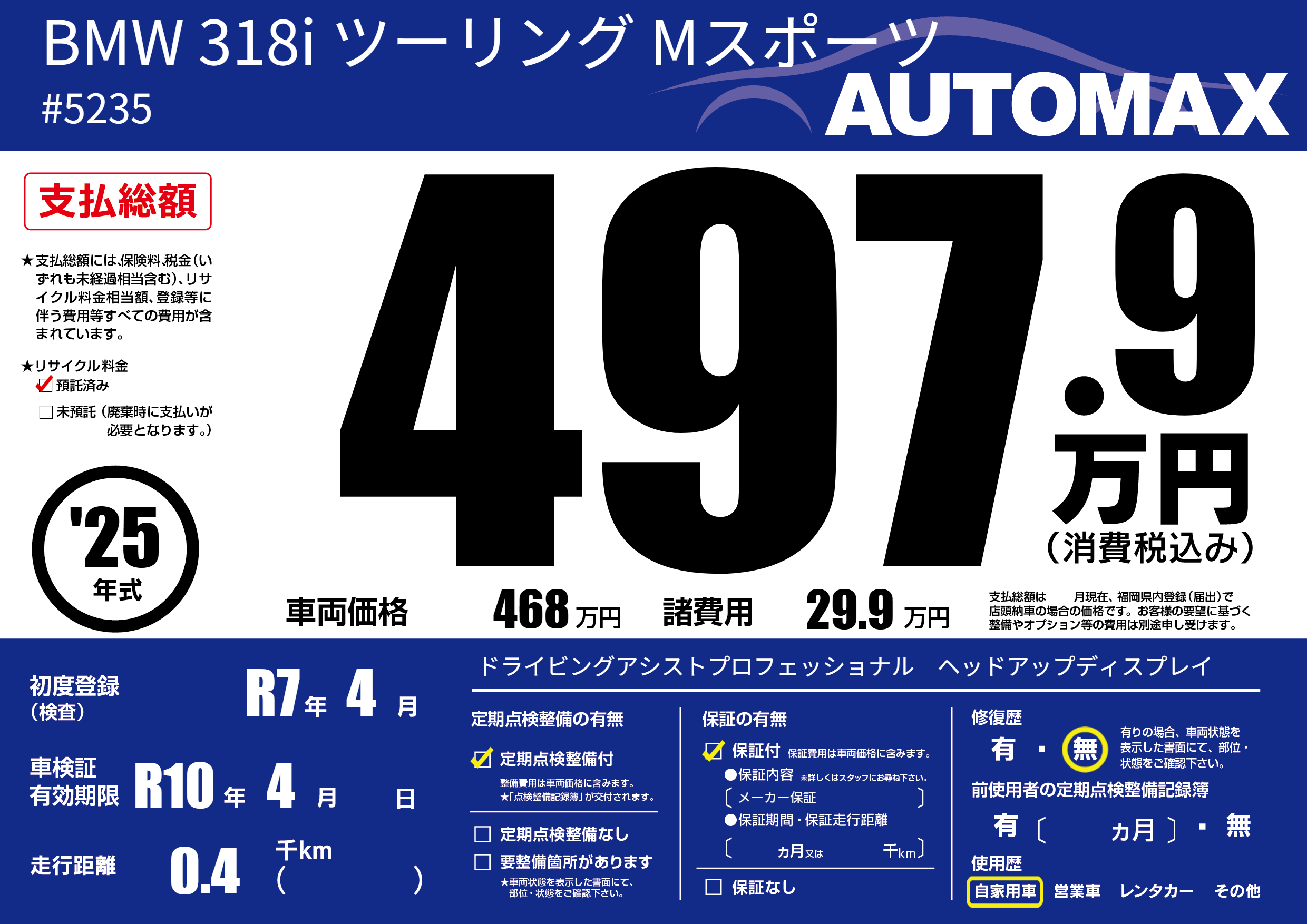 | 車名 | BMW 318i ツーリング Mスポーツ | グレード ミッション 排気量 |