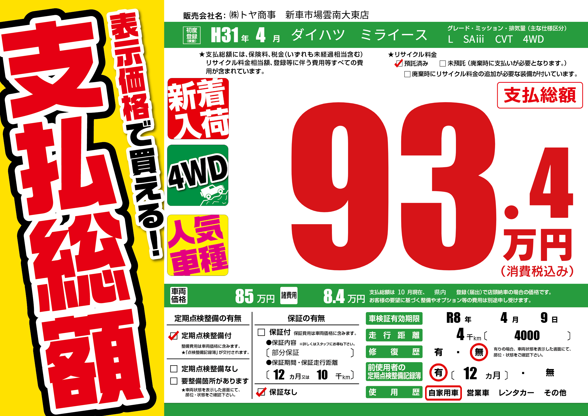 | 走行キロ | 0.4万km | 初年度登録 | H31年4月 |