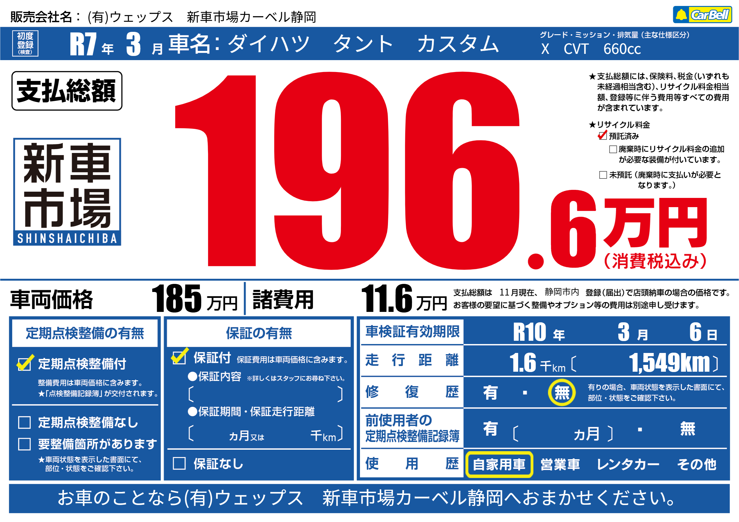 | 走行キロ | 0.1万km | 初年度登録 | R7年3月 |